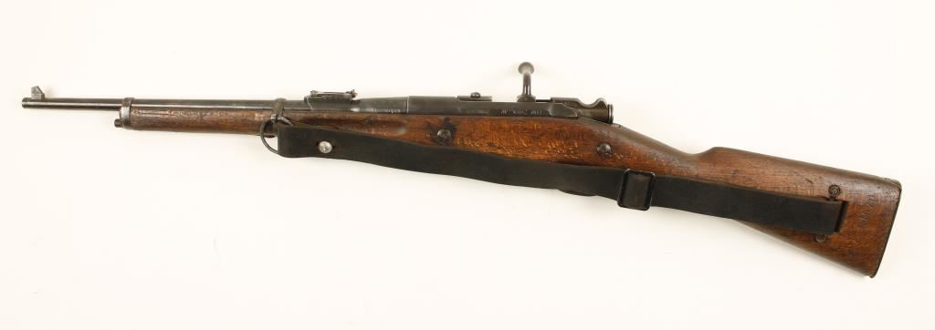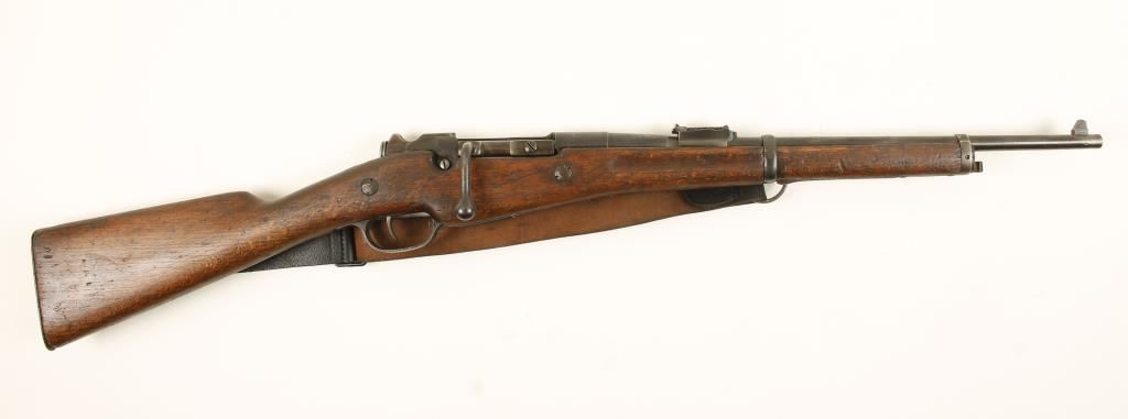 French military blued bolt-action carbine with a 17.7" barrel, a leather sling and no magazine. Made at Chaterellerault Arsenal in 1928. Bluing has some edge wear with surface rust, pitting and dings. Wood has the serial number stamped in it and also a faded cartouche on the other side. the wood is worn with dings and dents and scratches. Bore is frosty with strong rifling. Action is fine. Condition is poor to fair. *Modern Firearm*150