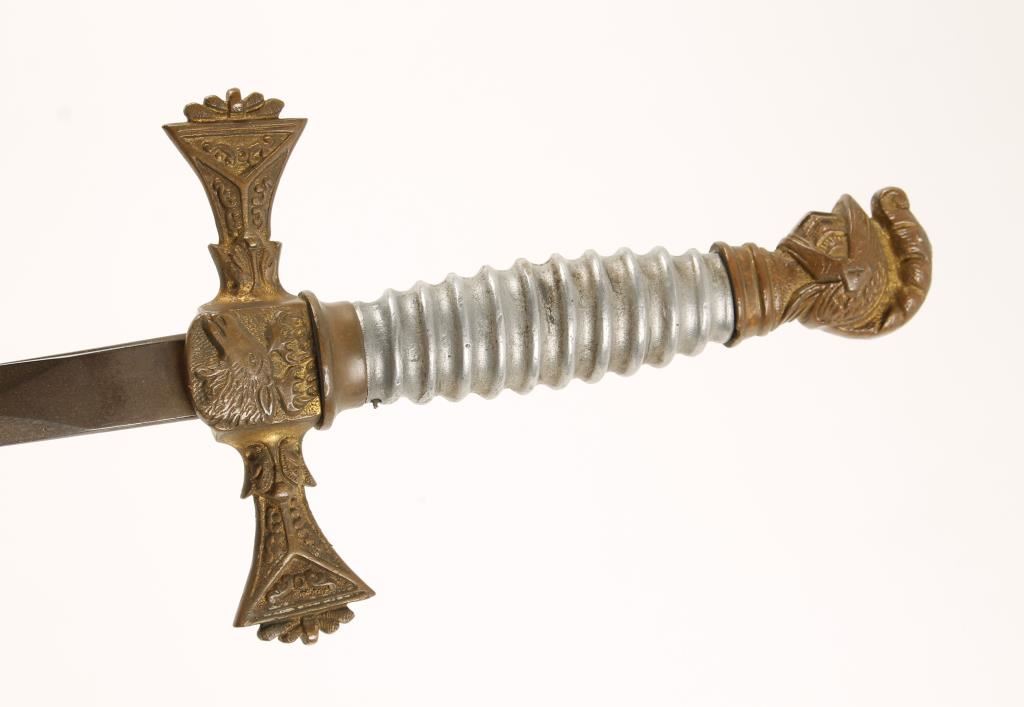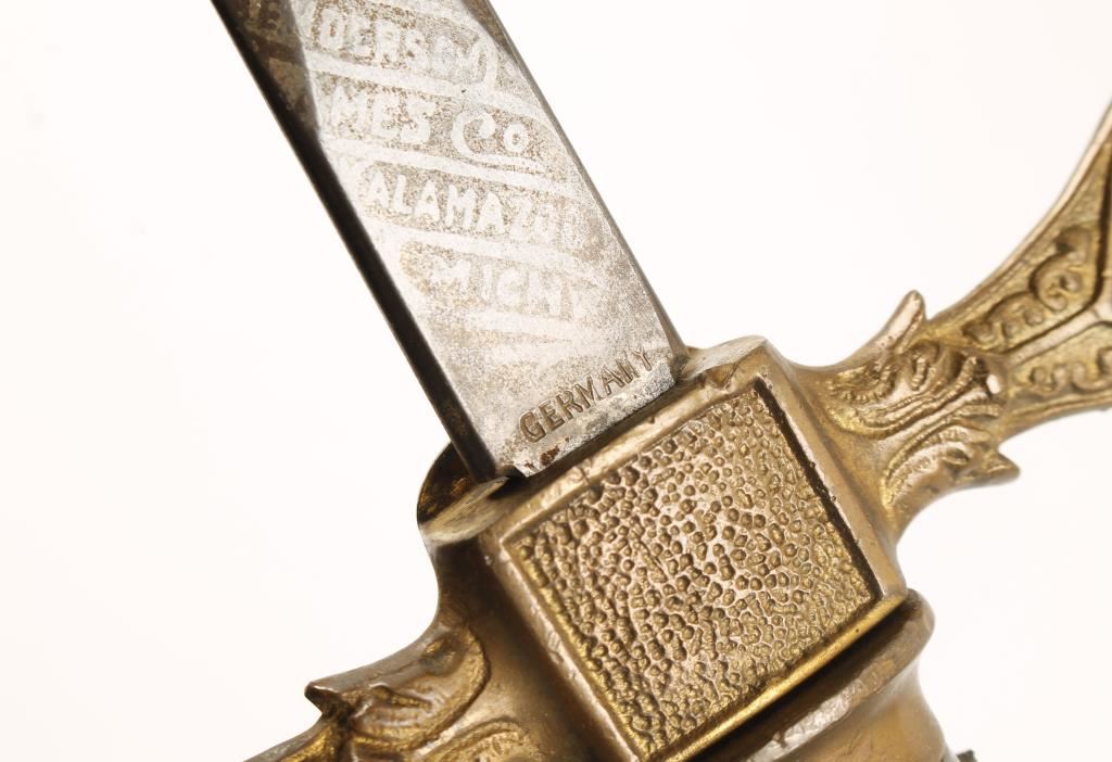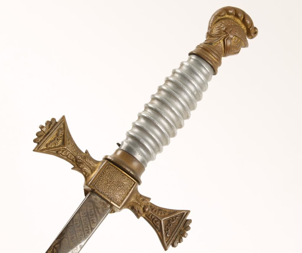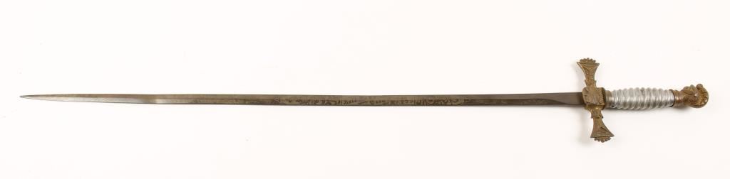 Used by the fraternal brotherhood with etched blade which reads "Salt Lake City Lodge #259, and on reverse F.O.M.". Elk and armor decoration. Shows age. Measures 35" overall with a 28" blade. Possible replacement of handle.