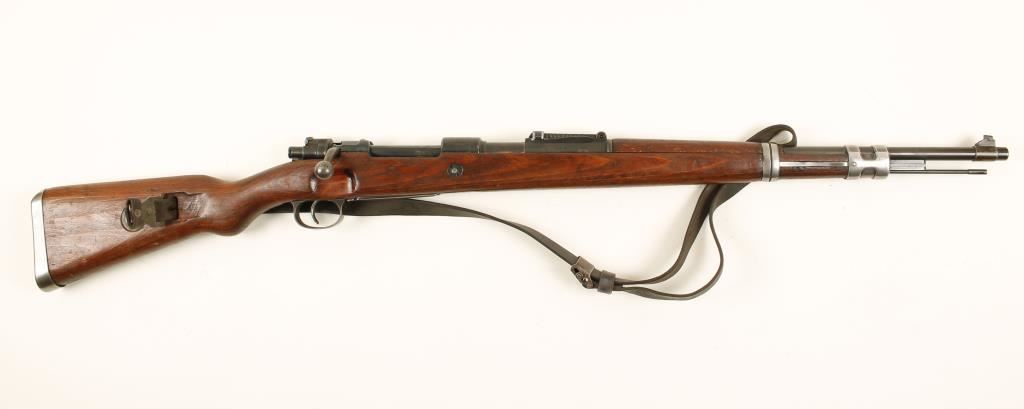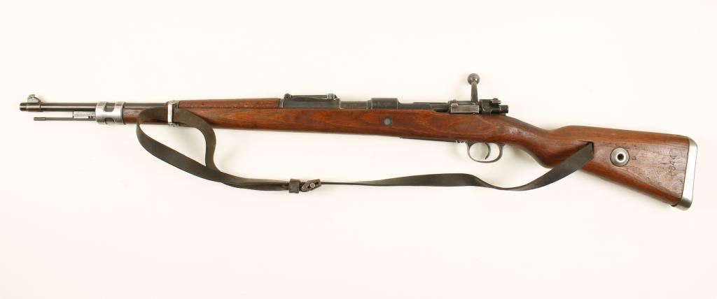 German military blued bolt-action rifle dated 1940, made by Steyr, with a 24" barrel and a leather sling. Bluing has wear and fading with mismatched bolt serial number. Wood is a little dinged and scratched. Bore is frosty with rifling. Action is good. Condition is good. *Modern Firearm*