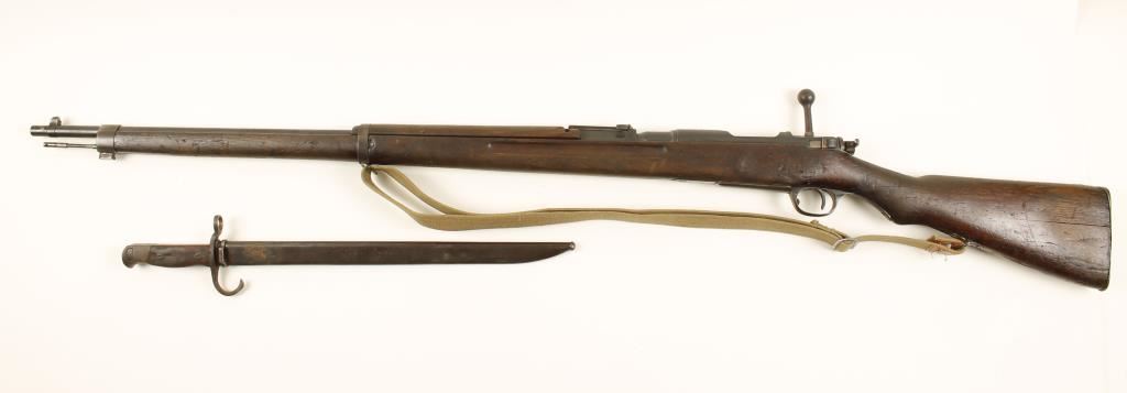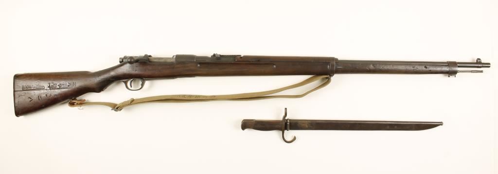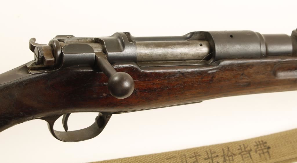 Japanese military blued bolt-action rifle with a 31.3" barrel, a web sling, a bayonet (with a 15-9/16" blade) and scabbard. "Mum" is intact. Bluing has dulled from freckles of surface rust. Trigger guard and floor plate have a brown/grey patina. Wood is dark and has a line of Kanji and a cartouche stamped in it with other characters carved in it. There is a repaired crack running back from the trigger guard. This stock has been battered. Bore is dark with rifling. Action is good. Condition is fair. *Modern Firearm*