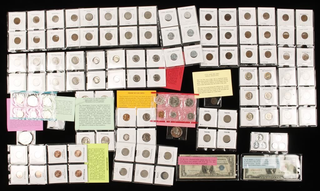 Including; Steel War Pennies, Indian Head Pennies, Civil War Indian Head Cent, Circulated and Uncirculated Wheat Pennies, Buffalo Nickels, Victory Nickels, Proof Kennedy Half Dollar, Eisenhower Dollar, Uncirculated Roosevelt Dimes, 2 Proof sets, Uncirculated and Old Jefferson Nickels, 2009 Lincoln Cent Set, 1909 Lincoln Cent, Uncirculated Washington Quarters, $2 Bill, and Silver Certificate. Fun Collectors Lot!