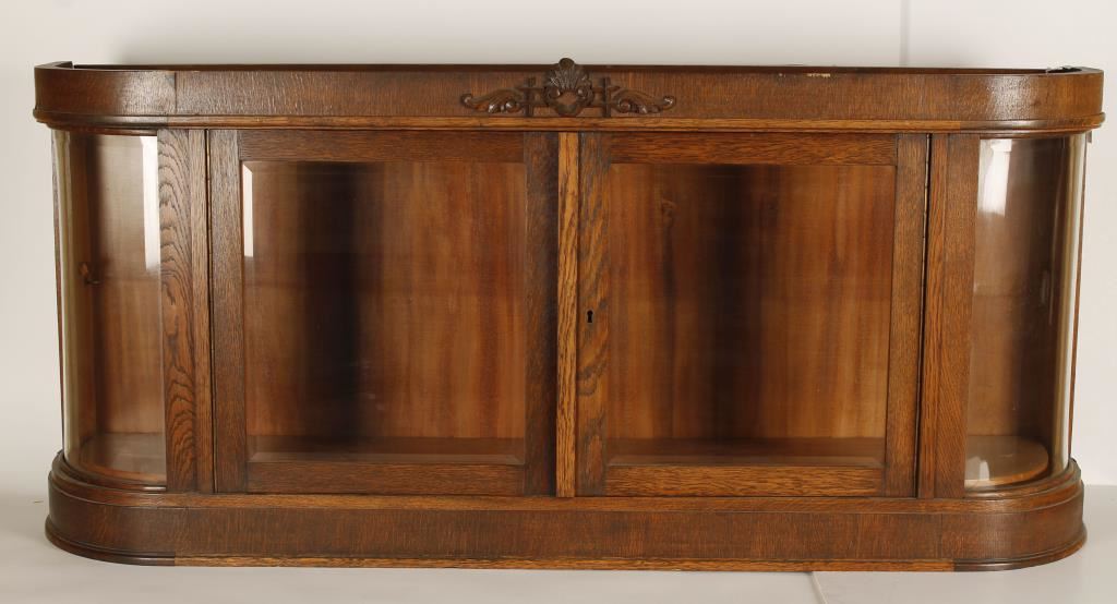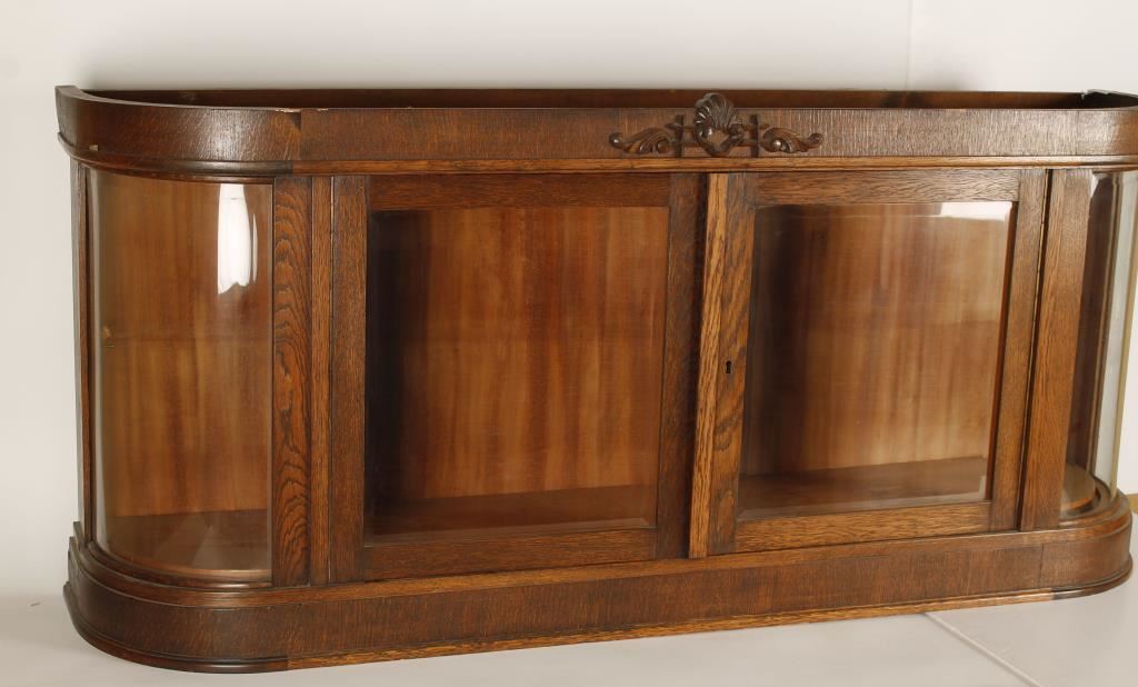 Measures 56"x 25". Two Glass doors. Clamshell and flourish design in the center. Great showcase!