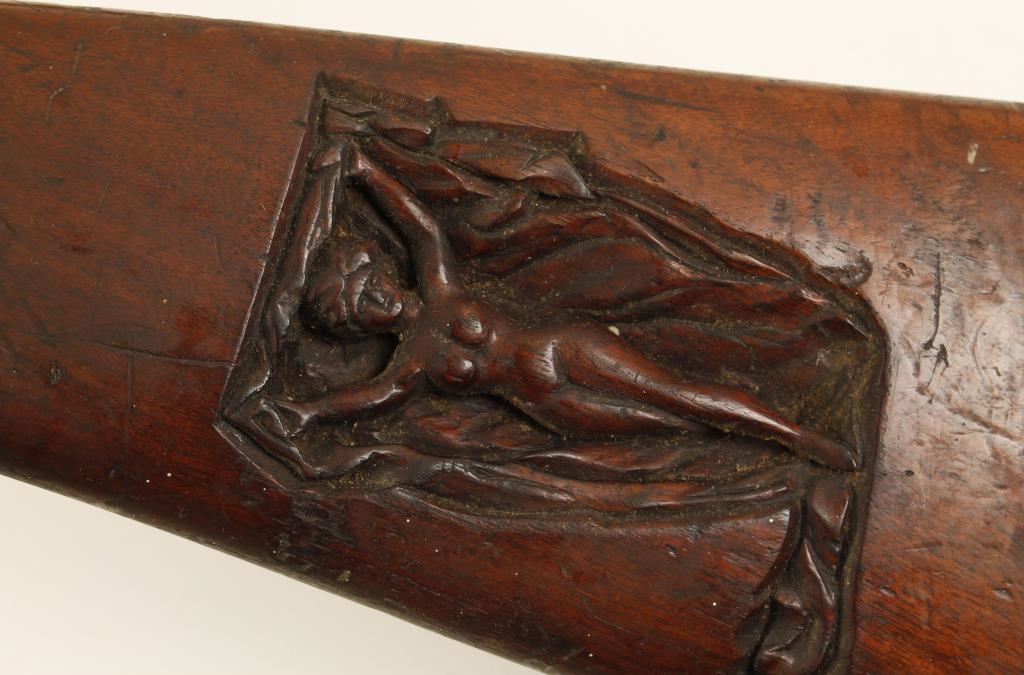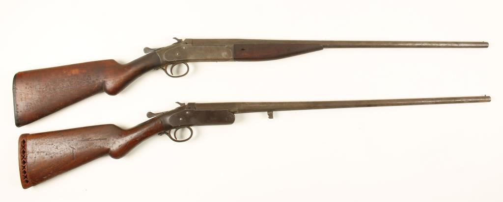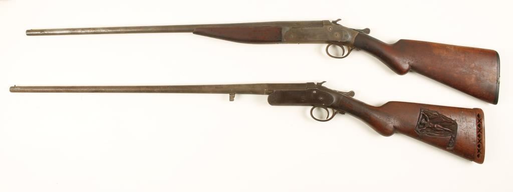 SN: 32130B & 50992. Two blued single-shot top-break shotguns with 26" barrels. One has no forend but it has a naked lady artfully bas relief carved on the buttstock along with cracks, scratches, dings and a semi-collapsed ill-fitted recoil pad. Bore on this gun is mirror bright except for a spot of surface rust inside the muzzle. Action works well. The receiver is blued that has turned to brown with surface rust and stains. Trigger guard screw is a replacement. Barrel exterior has turned to brown with surface rust. Barrels are both marked ".410 Gauge Choke Bore Barrel and Lug Forged in One". The other gun has a case-colored receiver with surface rust spotting. Blued barrel and trigger guard have turned brown with surface rust spotting. Plastic buttplate was split and has been crudely repaired with glue. Butt stock has a few cracks at the tang and some dings and scrapes. Splinter forend has cracks, dings, scratches and rubs. This bore is heavily pitted. Action works well. Condition is poor for each gun. *Modern Firearm*