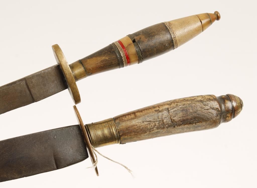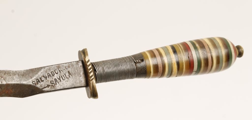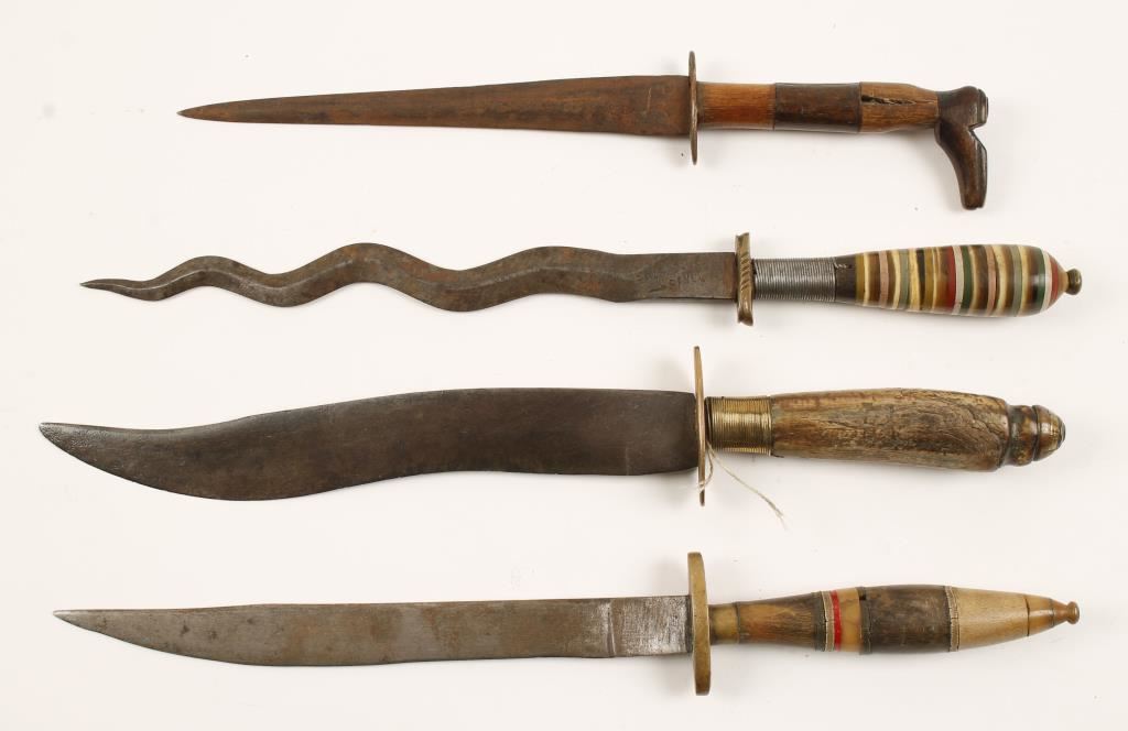 Including; (1) that has a wooden handle with a cowboy boot decoration, (1) that has a wavy blade with a stacked bakelite type handle, and (2) others.