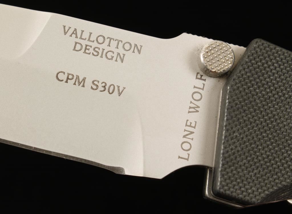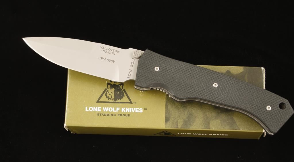 First Production dual action auto knife designed by Butch Valloton produced by Lone Wolf Knives. Features a 3.5" CMP-S30V blade, pocket and lanyard hole. Condition is like new in box.