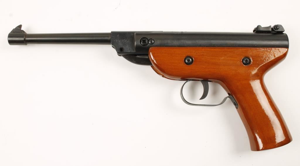 Chinese made single shot break action air pistol with 7" barrel. Blued finish. plain wood stock and adjustable rear sight. Includes original box. Condition: Excellent