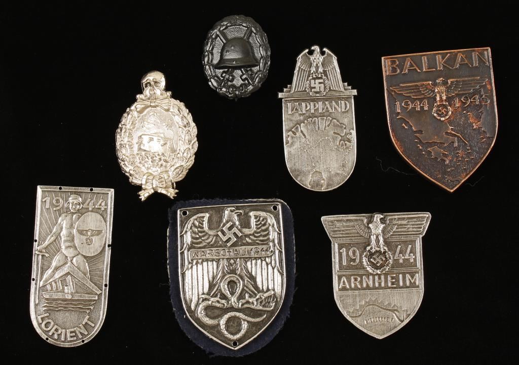 Including; Balkan 1944-45 shield, 1944 Lorient shield, 1944 Arnhein shield and a patch 1944 Warschau and others.