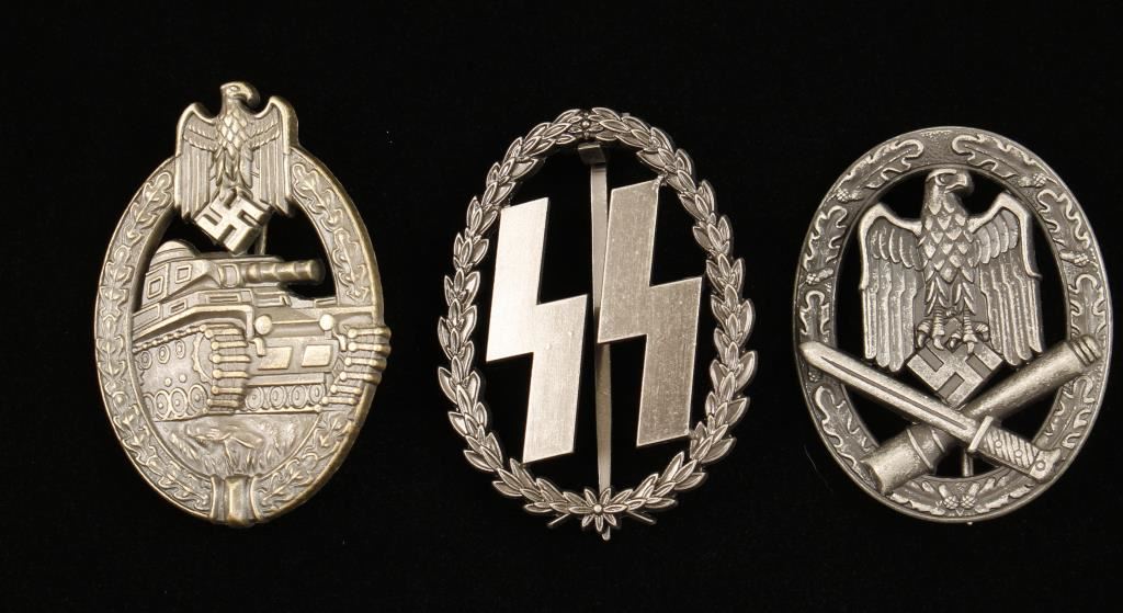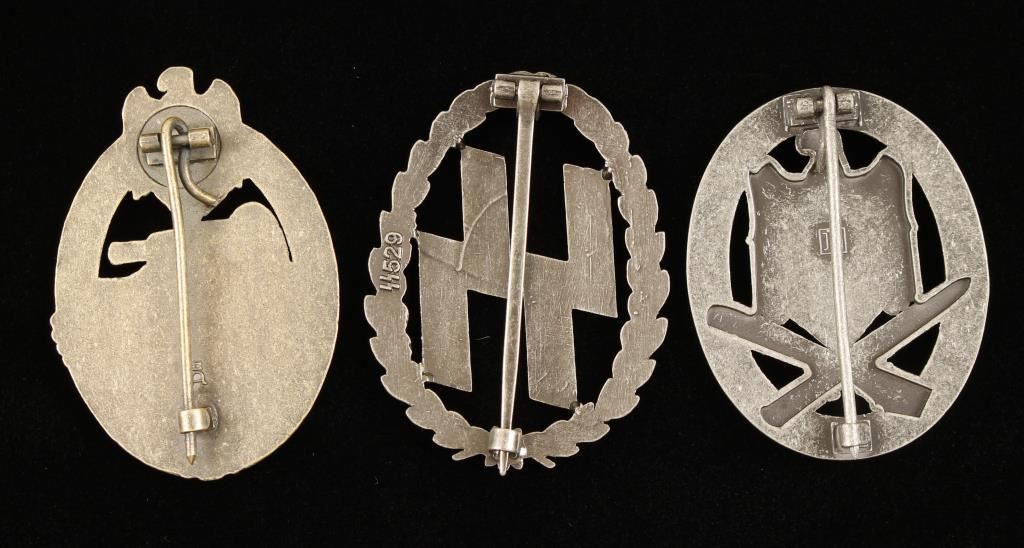 (1) Army Bronze Tank Assault Badge-maker marked 'HA' has a thin vertical pin back, bronze construction. (1) Waffen SS Silver Runic Badge-maker marked '529 SS', has a wide vertical pin back, three piece nickel construction. (1) Army Silver General Assault Badge-maker marked 'JFS', has a thin vertical pin back. Offered "as is", we don't guarantee the authenticity of this item, please do your research. All sales are final.