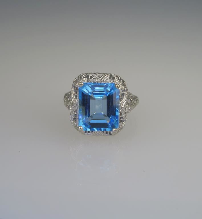 Emerald cut Topaz weighing approx. 7.00 carats set in intricate 14 karat white gold setting.