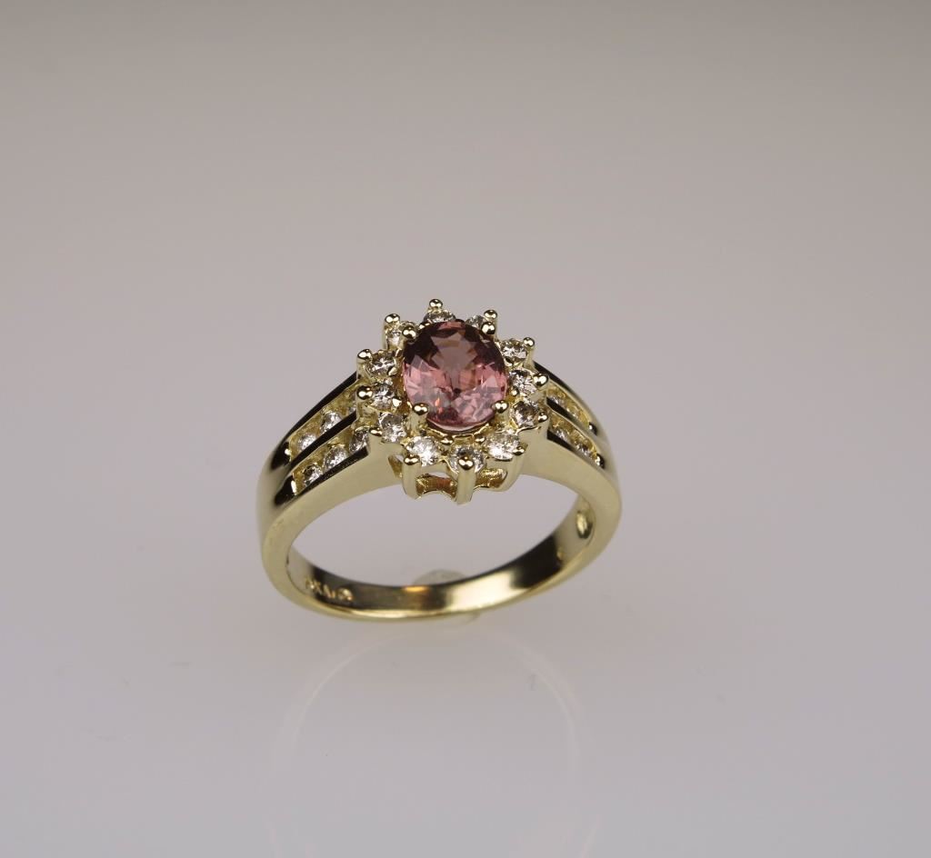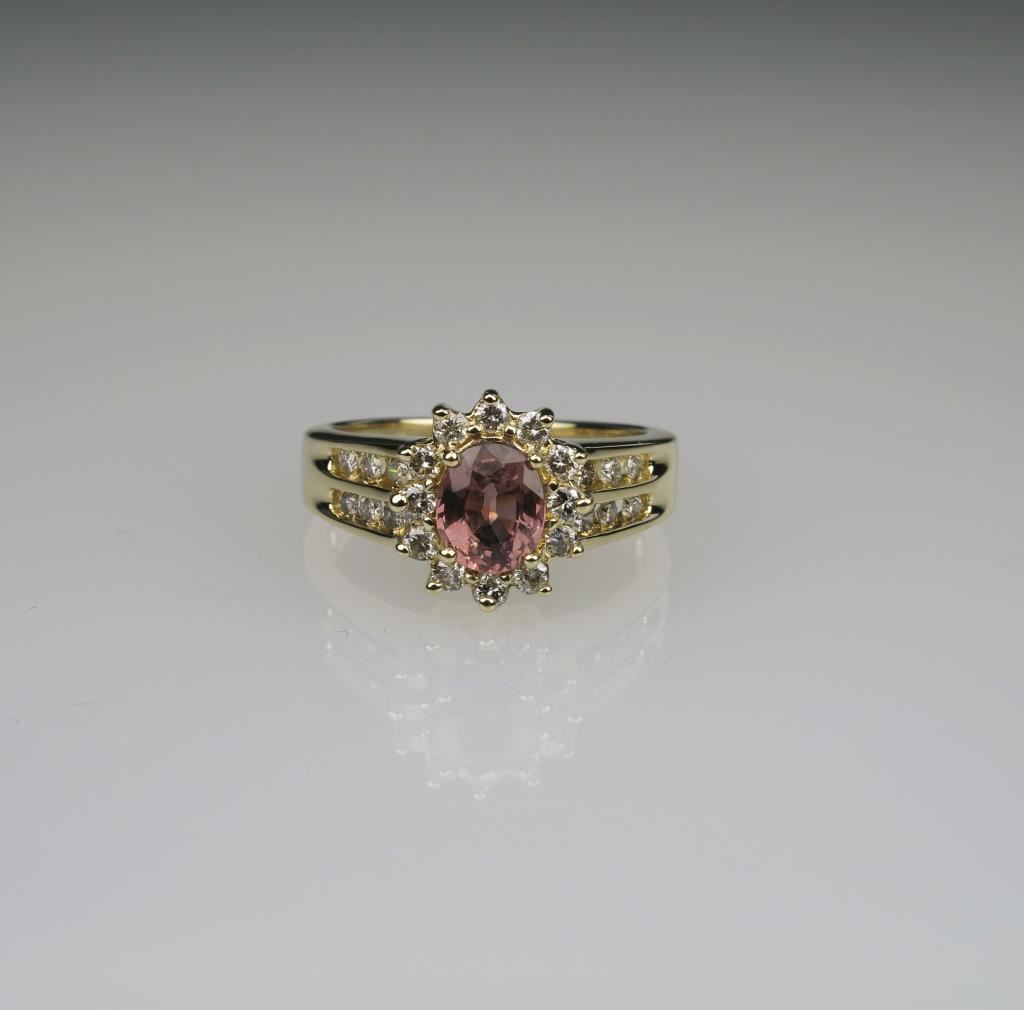 1.00 carat oval pink Tourmaline with 24 round cut Diamonds weighing approx. 0.60 with H-I colors set in 14 karat yellow gold.