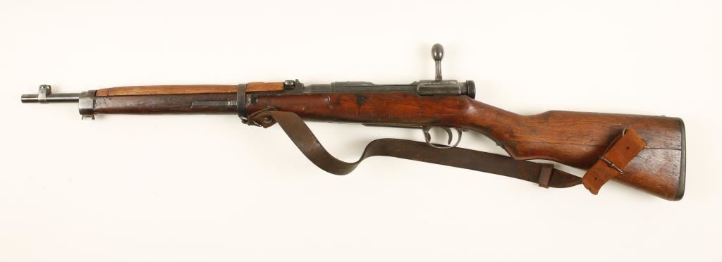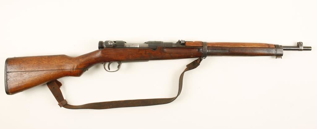 Japanese military blued bolt-action carbine with a 19" barrel and a web sling. "Mum" is ground off. Bluing is faded and turning brown with surface rust. Butt plate is rusted. Wood stock has the joint splitting and the compendium of other small damage. Bore is dark with rifling. Action works well. Condition is fair. *Modern Firearm*
