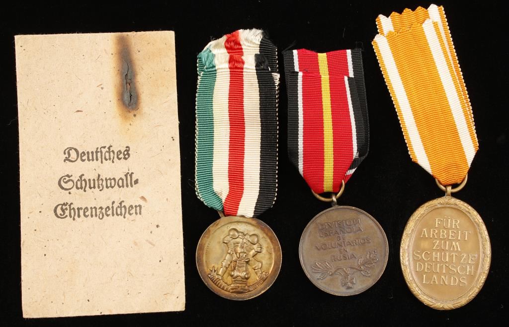 (1) West Wall Decoration includes the award paper envelope & issue ribbon. (1) Spanish Blue Division Eastern Front Decoration includes issue ribbon. (1) Army Afrika Korps Decoration includes the issue ribbon maker marked 'RZM 36/40 SS', aluminum construction. Offered "as is", we don't guarantee the authenticity of this item, please do your research. All sales are final.