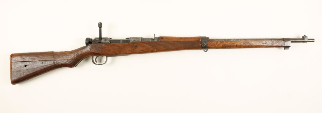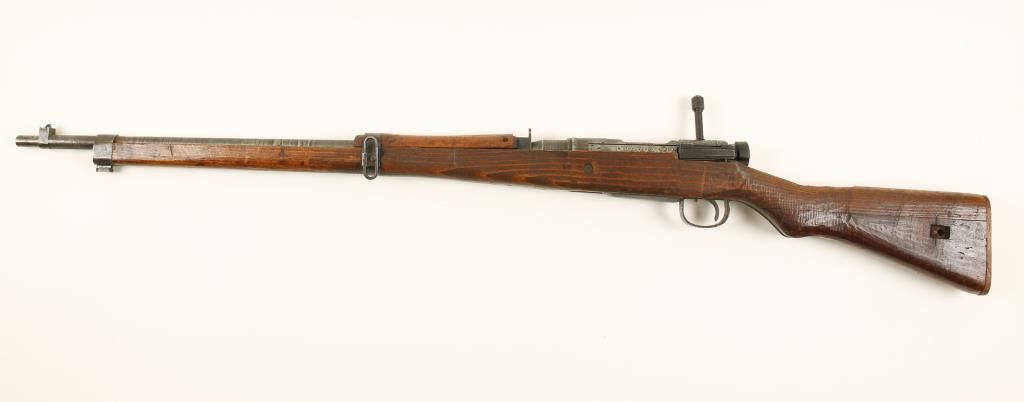 Japanese military "last ditch" blued bolt-action rifle with a 26" barrel. "Mum" is ground and there is no type marking. Metal finish is rough with bluing worn and fading and surface rust and pitting. Fixed rear sight. Wood butt plate. Stock appears hand hewn and the joint in the butt is splitting. It is missing the rear sling swivel and the forend is loose. Bore is dark with rifling. Action works. Condition is poor. *Modern Firearm*