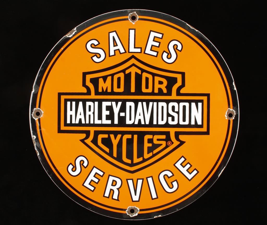 Vintage Advertising Sign. Measures 11 3/4" in diameter. The front reads 'Sales Harley Davidson Motorcycles Service'. There is chipping around the four mounting holes and in areas around the edge. Has smooth porcelain around the front and the back. Offered "as is", we don't guarantee the authenticity of this item, please do your research. All sales are final.