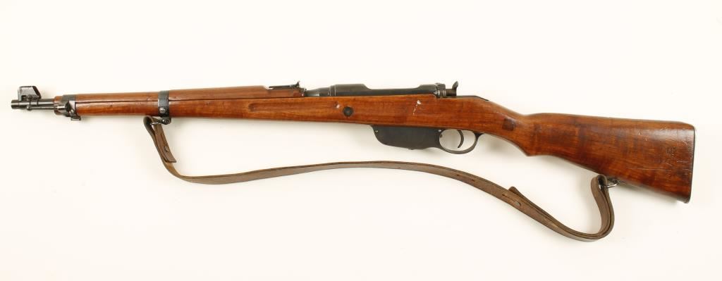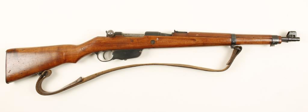 Austrian military blued bolt-action straight-pull carbine with a 20" barrel and a leather sling. Bluing is good with edge wear. Stock has 4 wood patches and the initials "K.A.B." stamped in it. Two of the patches are at the rear cross bolt location. There are also the usual dings. Bore is frosty with rifling. Action works well. Condition is fair. *Modern Firearm*