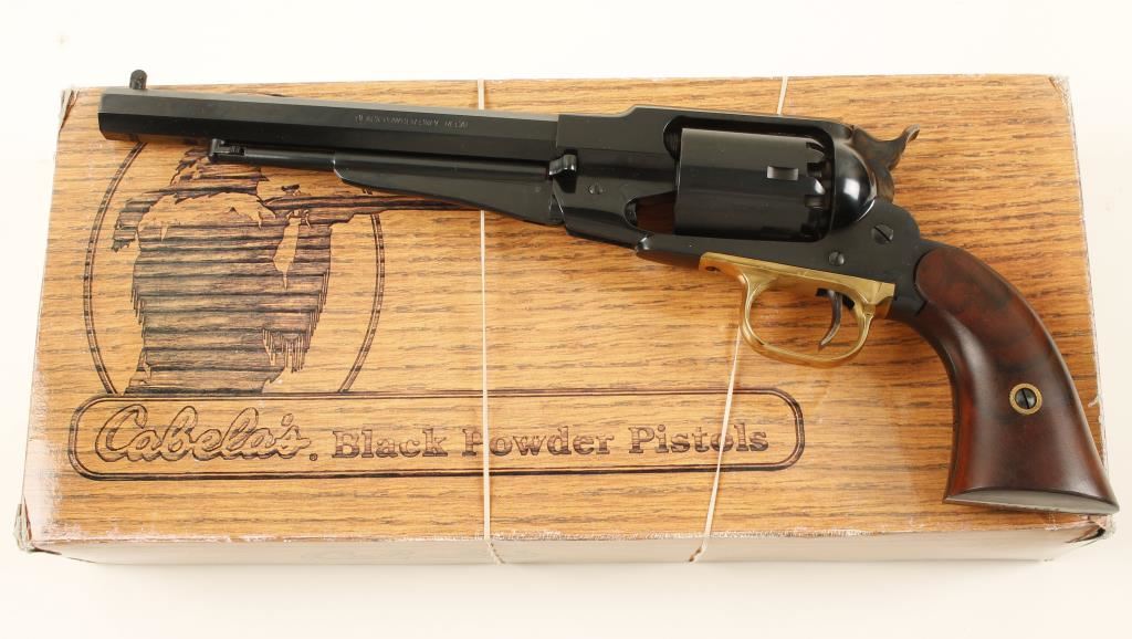 Replica Revolver of the 1858 Remington, Blackpowder, Deep Blue Finish. Octagon barrel, wood grip, brass trigger guard, case colored hammer,, in Cabela's wood grain box. Condition overall excellent. *Antique Firearm**