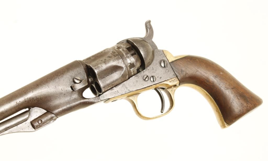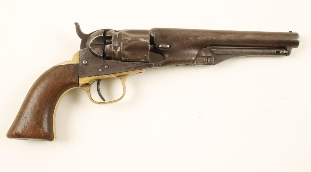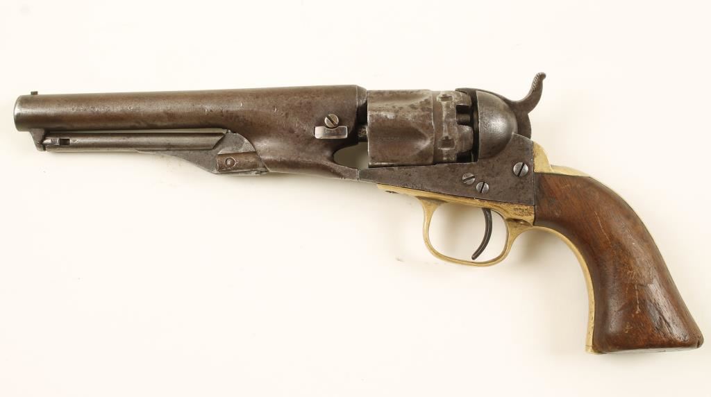 5 shot single action percussion revolver. Mid-production with 5.5" barrel, half fluted cylinder, one piece walnut grips and all matching serial numbers. Blued cylinder and barrel have gone to a brown patina. Case hardened frame, hammer & loading lever have gone to a gray patina. Cylinder does not move when cocked. Overall condition is fair. *Antique Firearm*