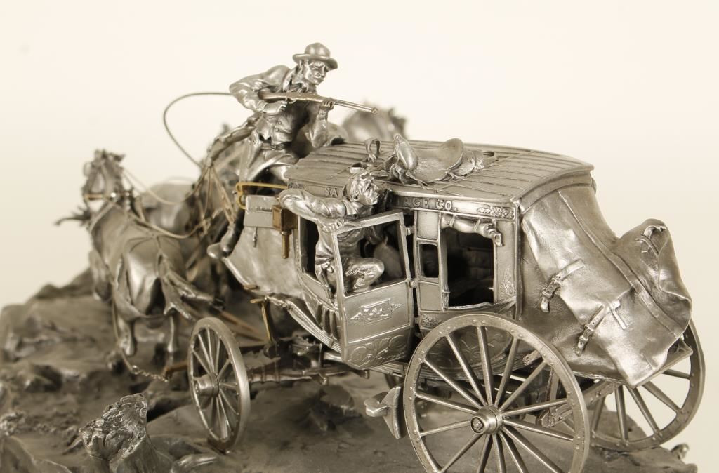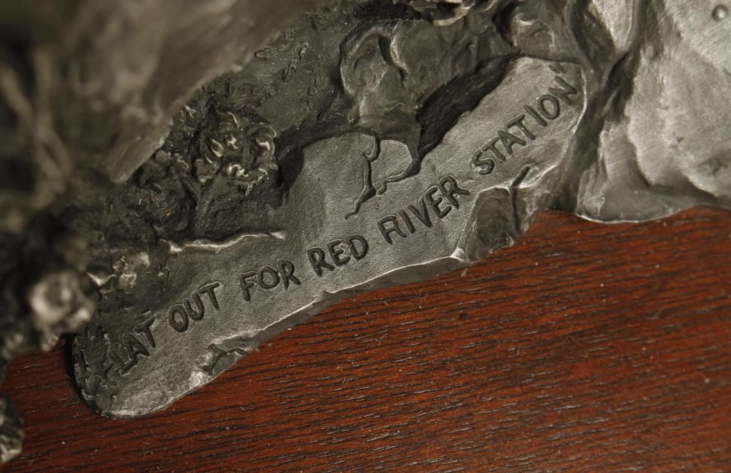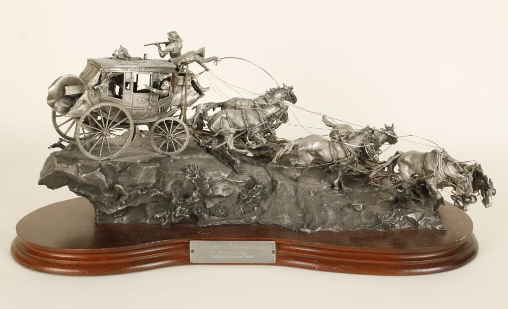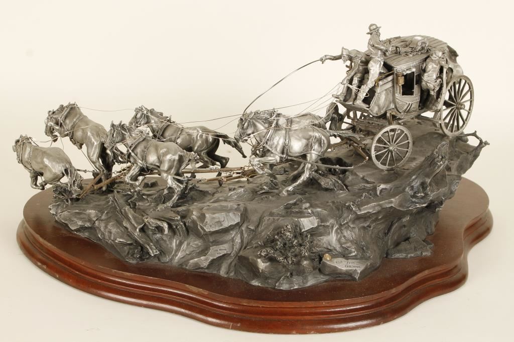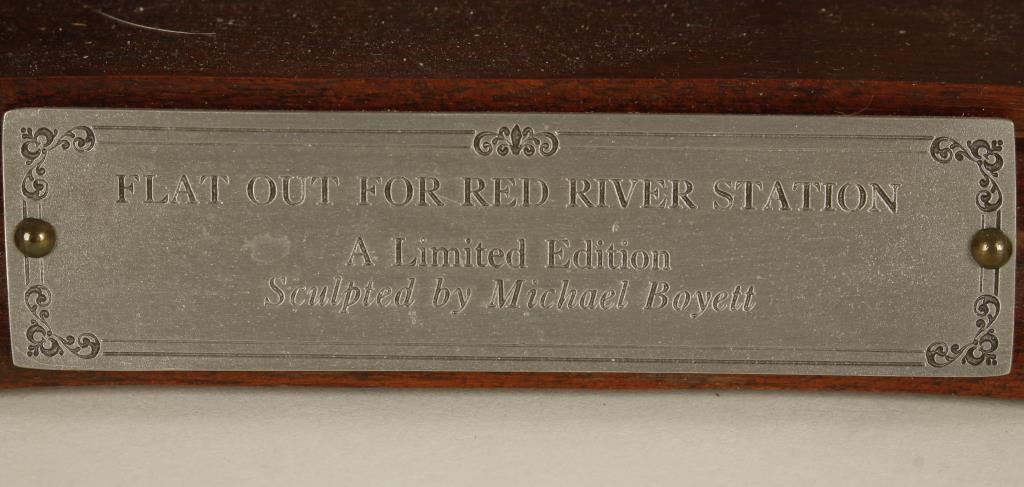 Beautiful Limited Edition (2347/2500) pewter cast sculpture on wood base entitled “Flat Out For Red River Station” by Michael Boyett, approx. 19” long x 12” wide x 8” in height showing the Santa Fe Stage racing along a rocky trail, pulled by six galloping horses with the shotgun rider and passengers firing at pursuing trouble; great action and detail! A great piece for any Western-theme room or office. Has damage to one horses legs easily fixed.