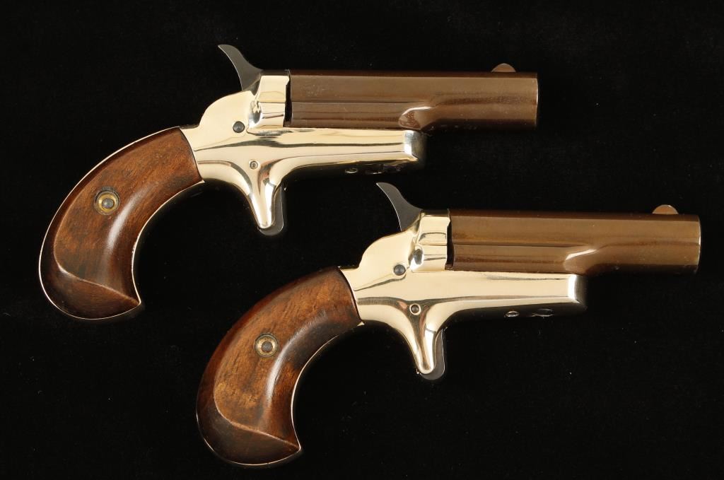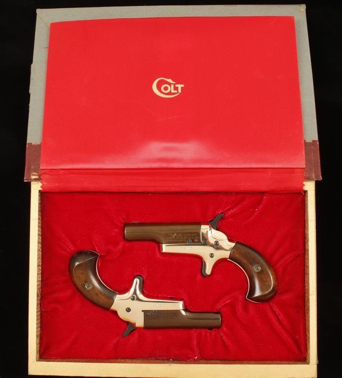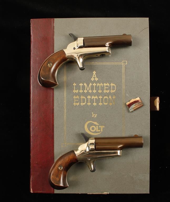 4th Model Single shot derringers in "Colt Derringers" book case. 2.5" barrels with brown patina, wood grips and nickeled frames. Strap on book case has deteriorated. Overall condition of this set is very good. *Modern Firearms*