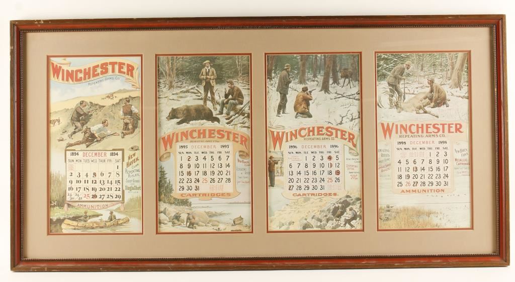 Winchester advertising calendars years 1894, 1895, 1896 & 1898 framed and double matted. Frame measures 41.5" x 21".