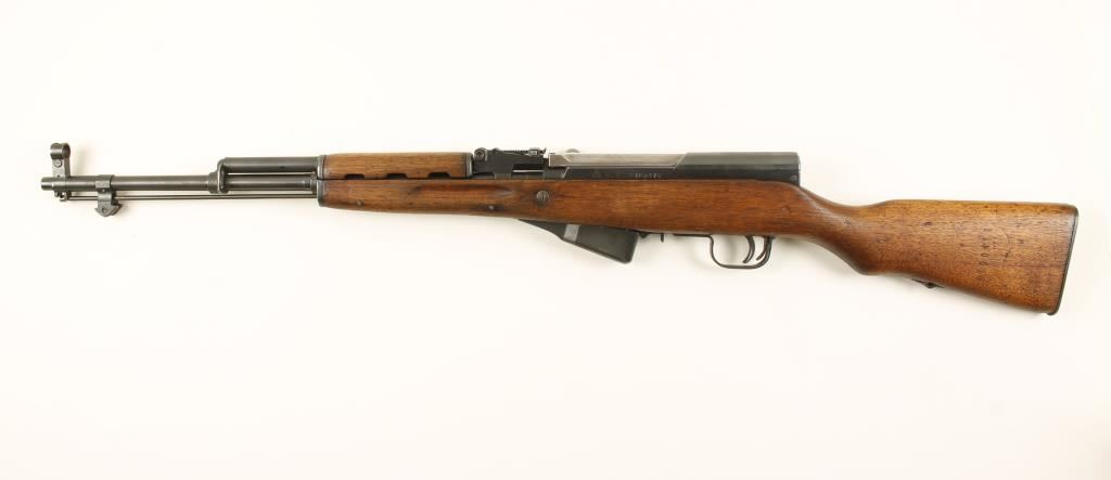 Chinese made semi auto military rifle with 19-1/2" barrel. Blued finish, oil finished wood stock, hooded front sight graduated rear sight to 1,000 meters, 10 shot fixed magazine. All numbers matching including stock. Very good bore and action. Condition: Good overall showing high point wear and dings and bruising in wood. *Modern Firearm*