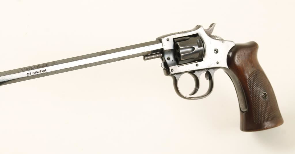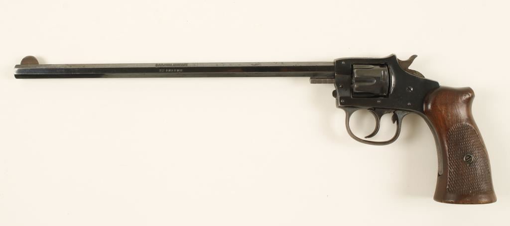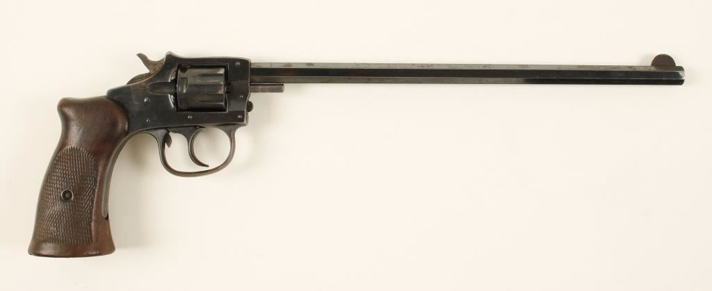 Harrington & Richards. Blued nine shot revolver with 10" octagonal barrel. fixed sights, & checkered walnut grips. High finish gun with wear at muzzle, cylinder edges, right side of frame and bottom of trigger guard. Barrel has many small dings and scratches. Overall condition is good. *Modern Firearm*