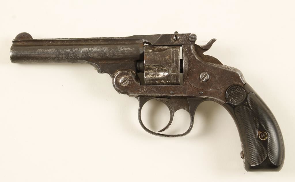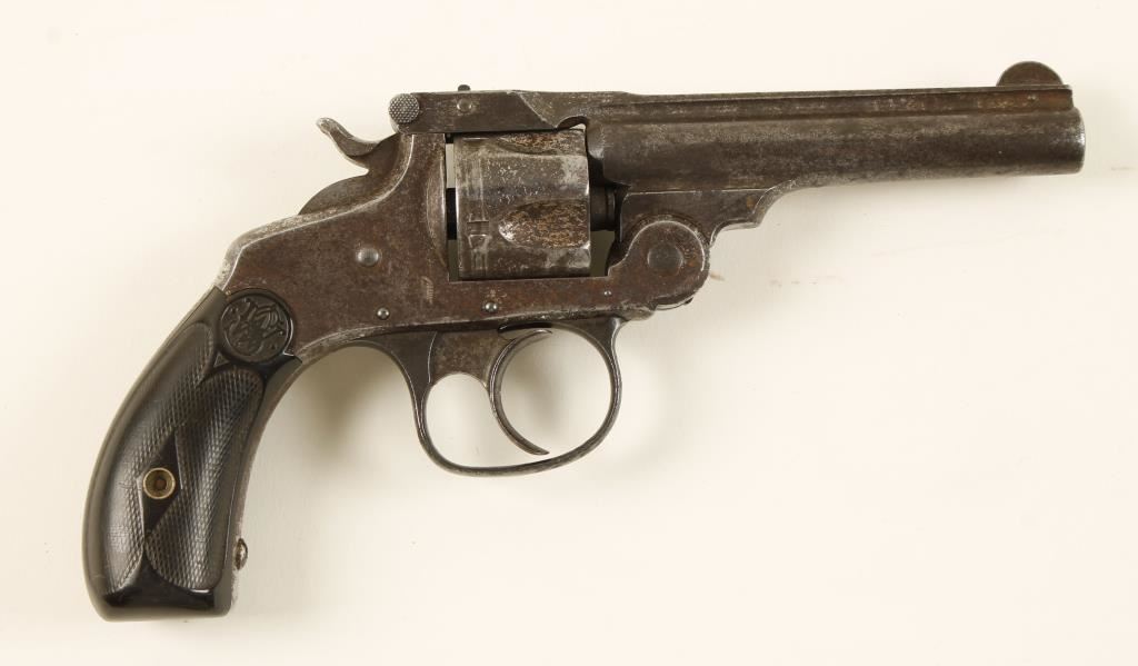 Nickeled 5 shot break-open revolver. 3.5" barrel with fixed sights and black hard rubber grips. Less than 10% finish remaining with dark patina and pin pricking. Action works well and checkered grips have been worn smooth. Overall condition is poor. *Modern Firearm*