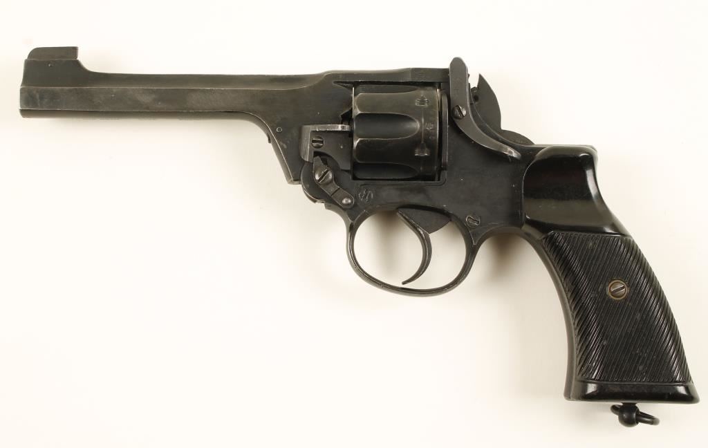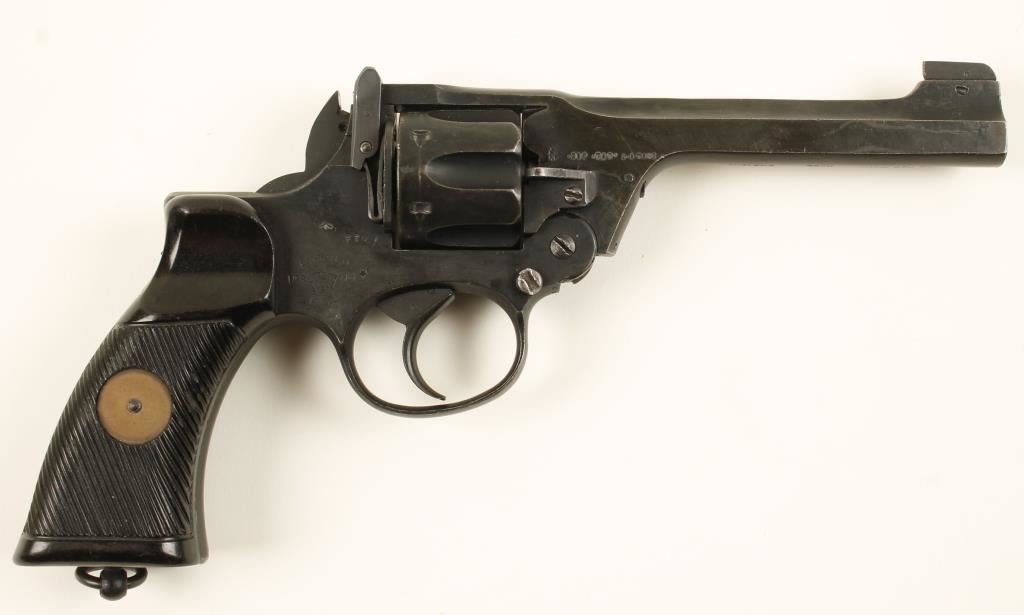 English top break double action military six shot revolver. 5" barrel, fixed sights, lanyard ring and black hard rubber grips. Matte black finish is 90% intact. Action and bore are very good. Overall condition is good to very good. *Modern Firearm*