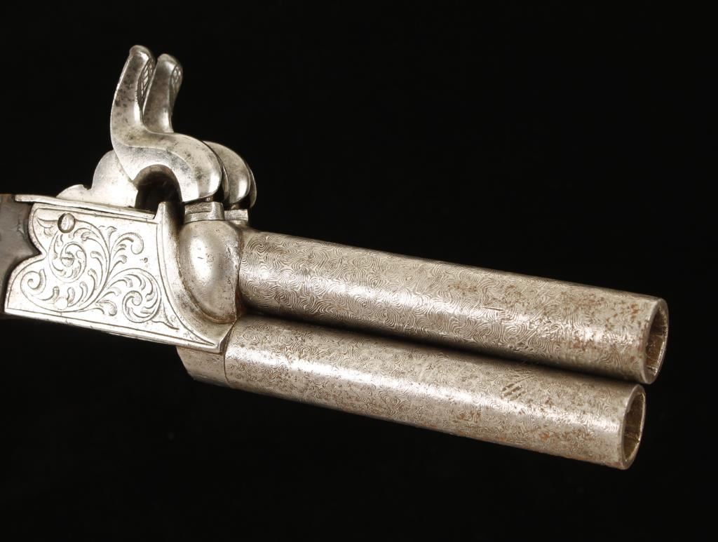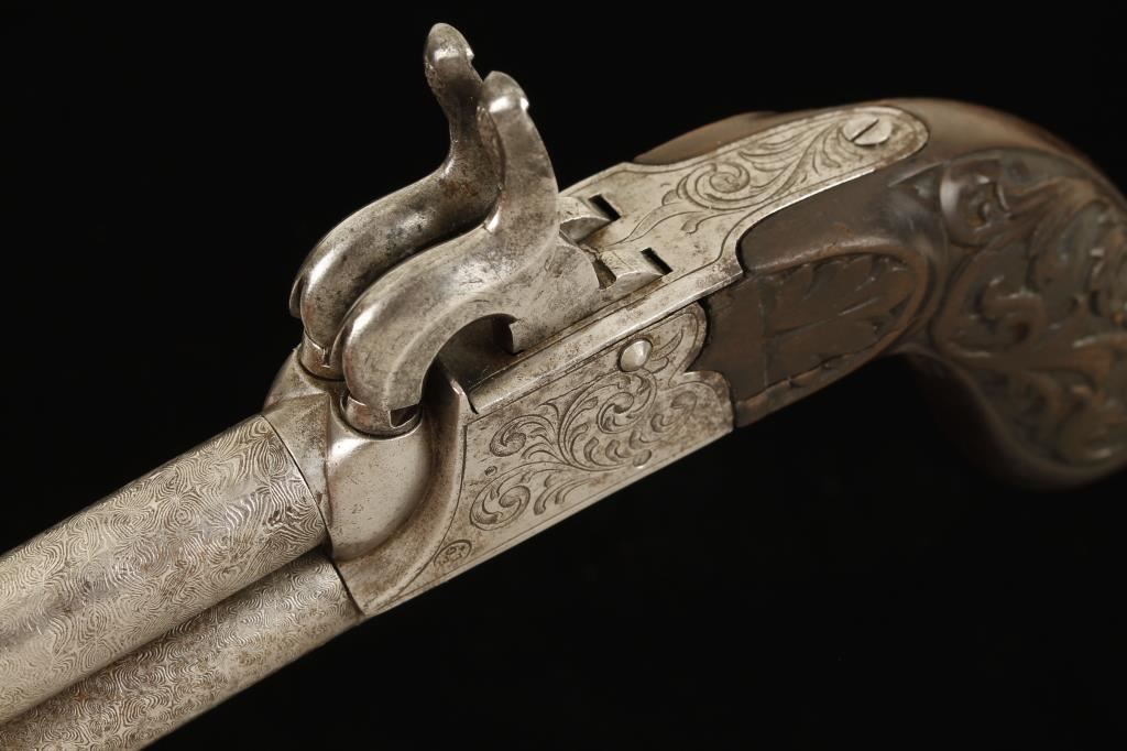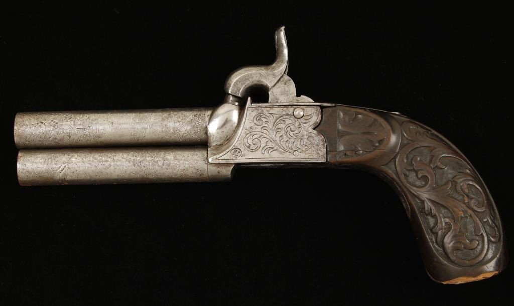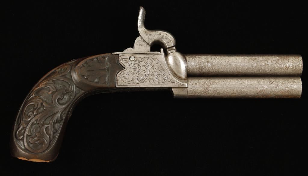 Percussion pistol with damascus barrels with floral motif engraved sideplates with ornate carved grips, ebony stock missing butt-cap and also have minor cracks due to age. Has flip down trigger. Condition is overall very good for it's age. *Antique Firearm*