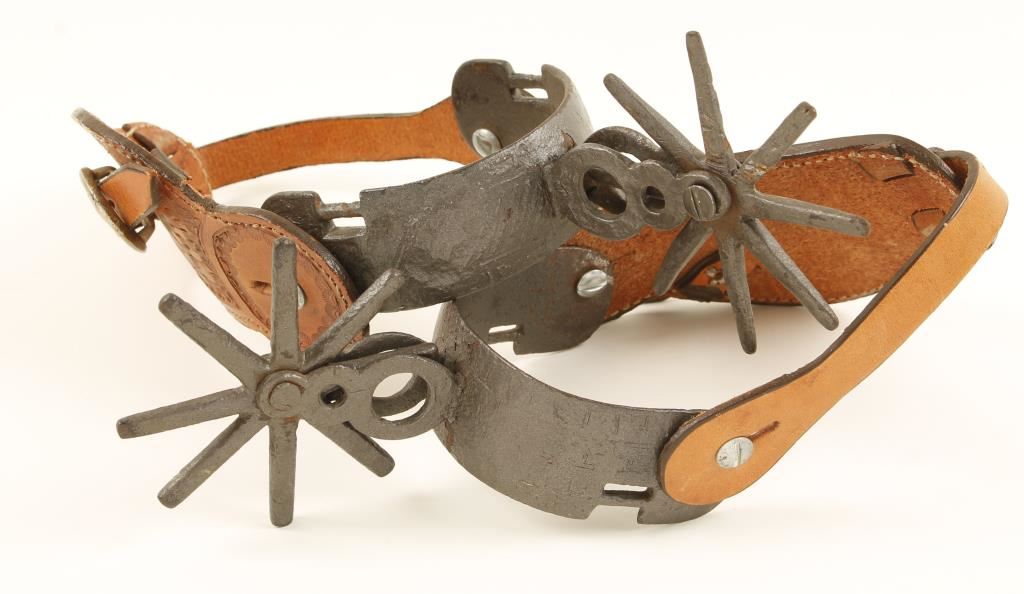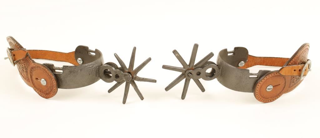 Spanish style spurs with large rowels and tooled leather straps in basket weave design. Great decorator piece.