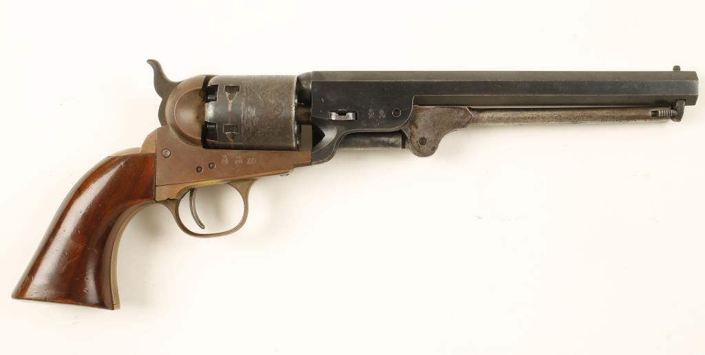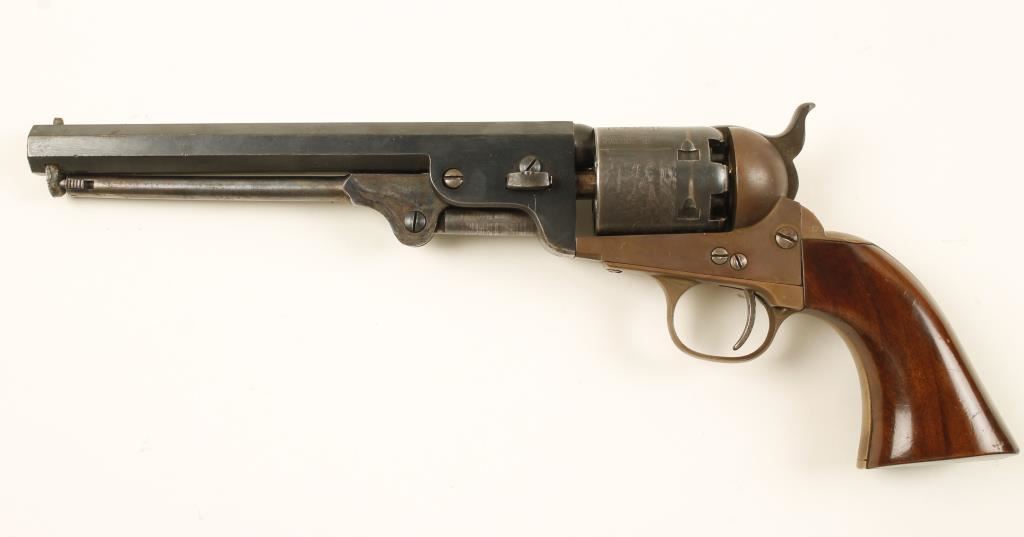Italian made Colt 1851 reproduction percussion pistol. Features 7.5" blued barrel, blued cylinder, case hardened loading lever and brass frame, backstrap and trigger guard. Action works well & finish is 70% intact. Overall condition is good. *Antique Firearm*