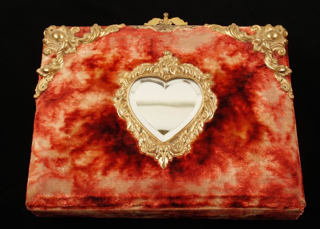 Beveled heart shape mirror on outside. Several sepia toned photos of family portraits and 3 antique tin type portraits.