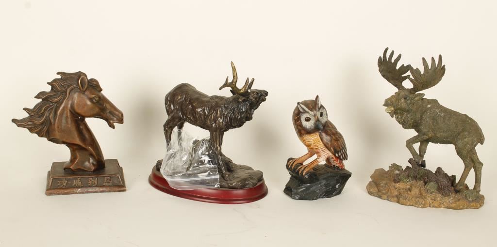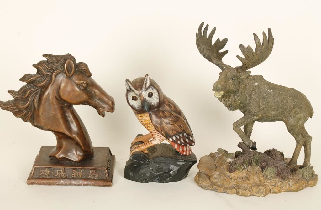 Moose, Horsehead, and Elk with broken antlers and an Owl. Made of various materials.