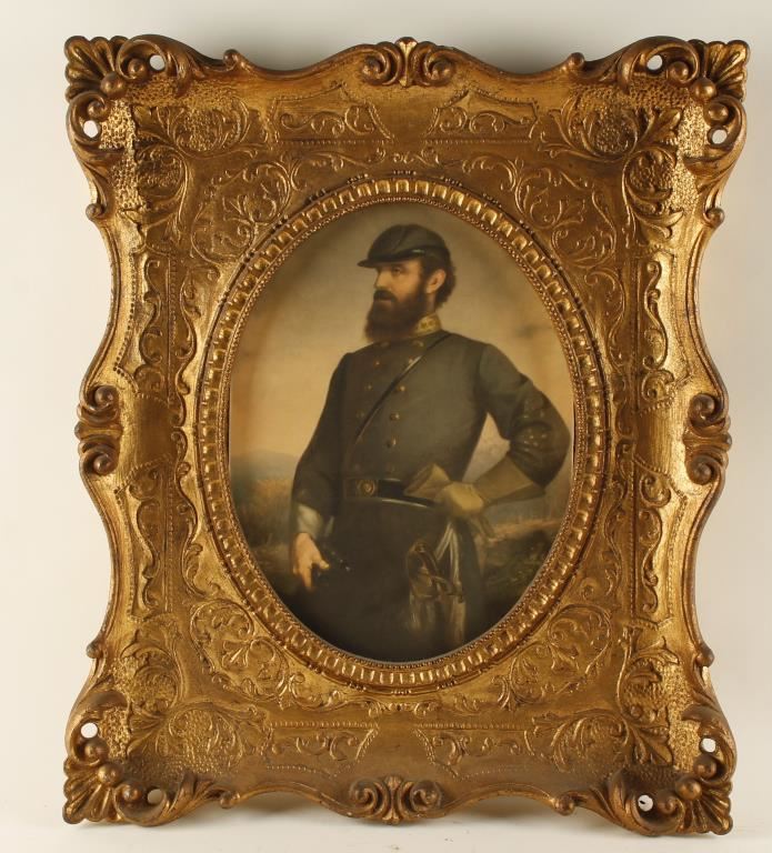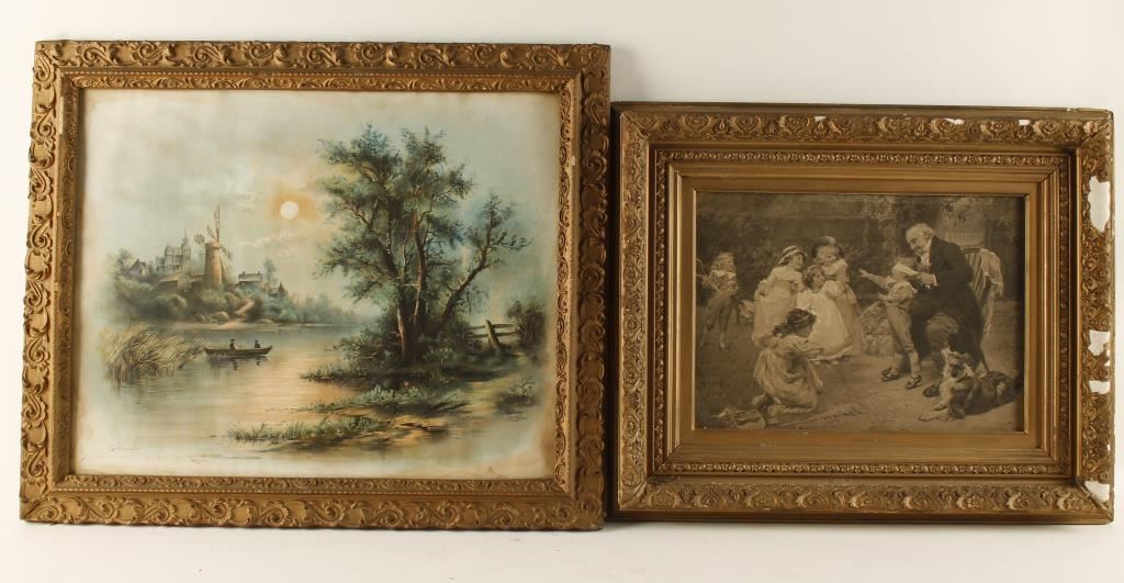 Including; Man reading to children 14"x10", Dutch waterway scene with couple on the water and windmill in background signed Chandler 16"x20", and a Jeb Stuart print. All in gold period frames.