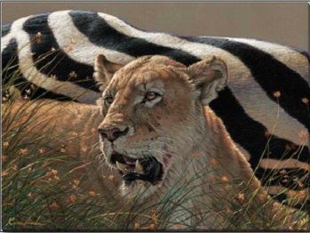 "Situated in the Ngorongoro crater in Africa, a lioness rests for a moment following the kill, her sides heaving as she pants deeply. I chose to use the zebra as the backdrop for the lioness. In this way the picture was infused with the image of Africa." Lee Kromschroeder - artist