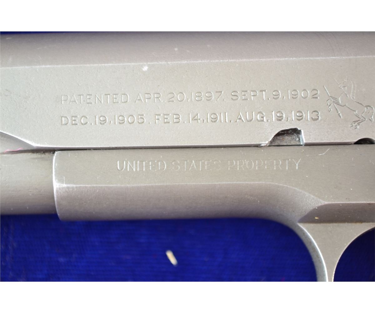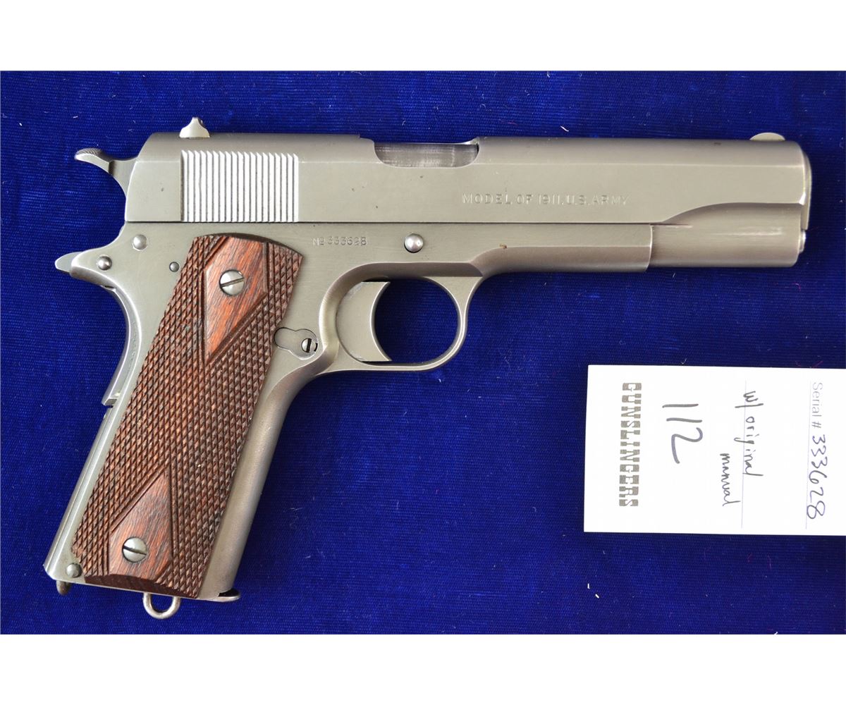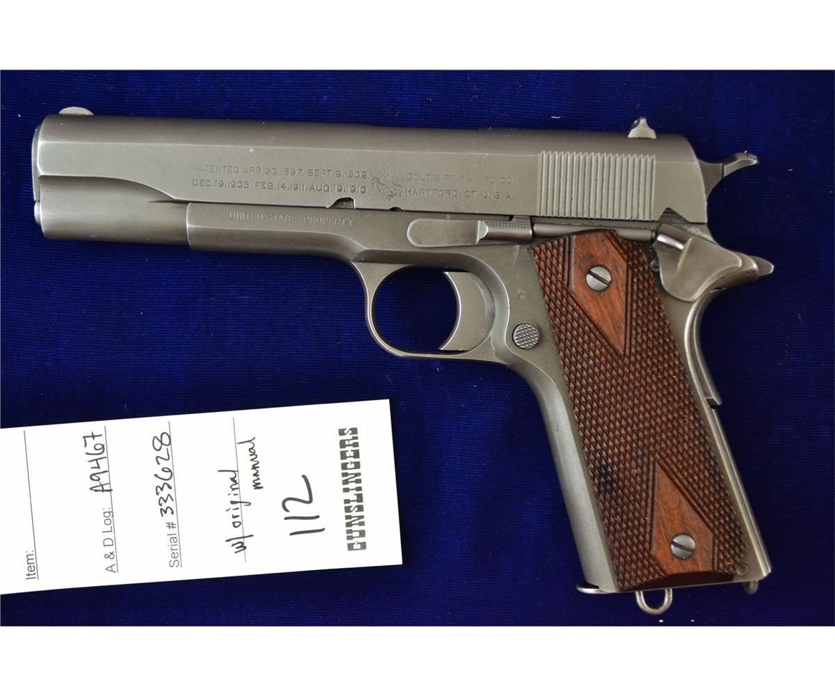 COLT 1911 PARKED FINISH HAS EAGLE S11 STAMPING SERIAL NUMBER HAS LAST NUMBER BEEN RESTRUCK COMES W/ ORIGINAL WAR DEPT MANUAL LANYARD LOOP MAG A9467 SERIAL 333628