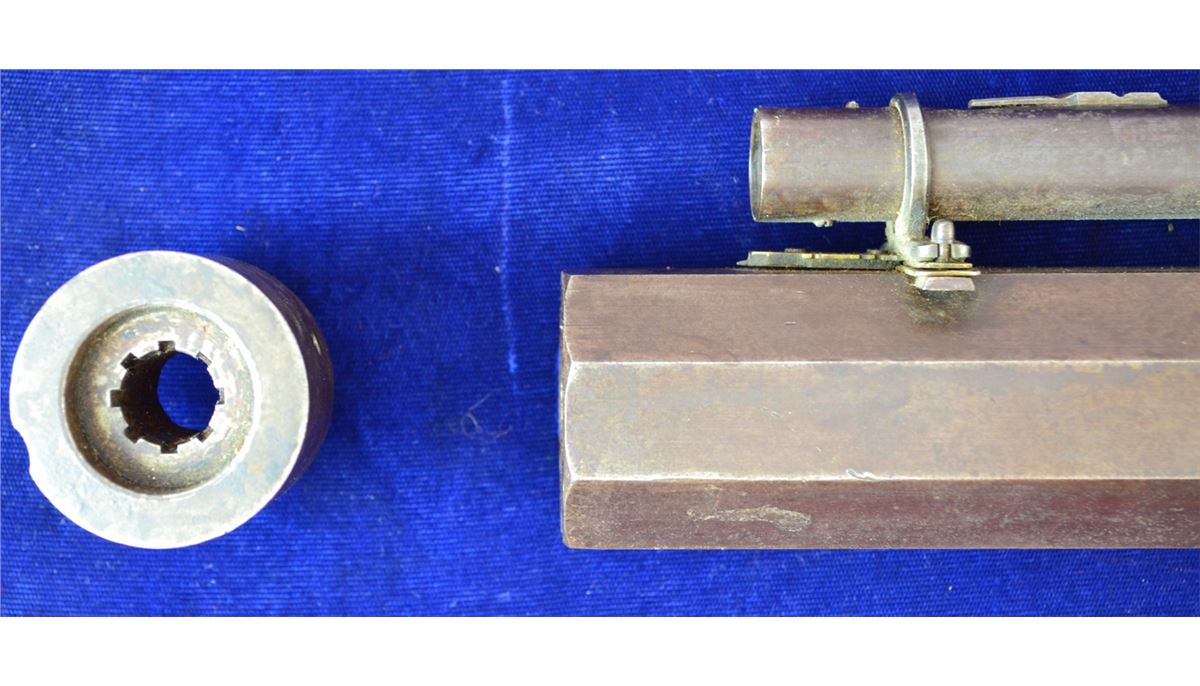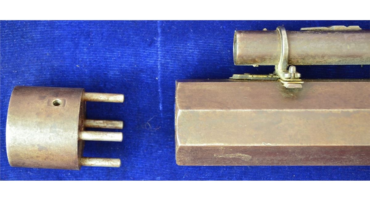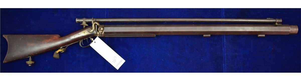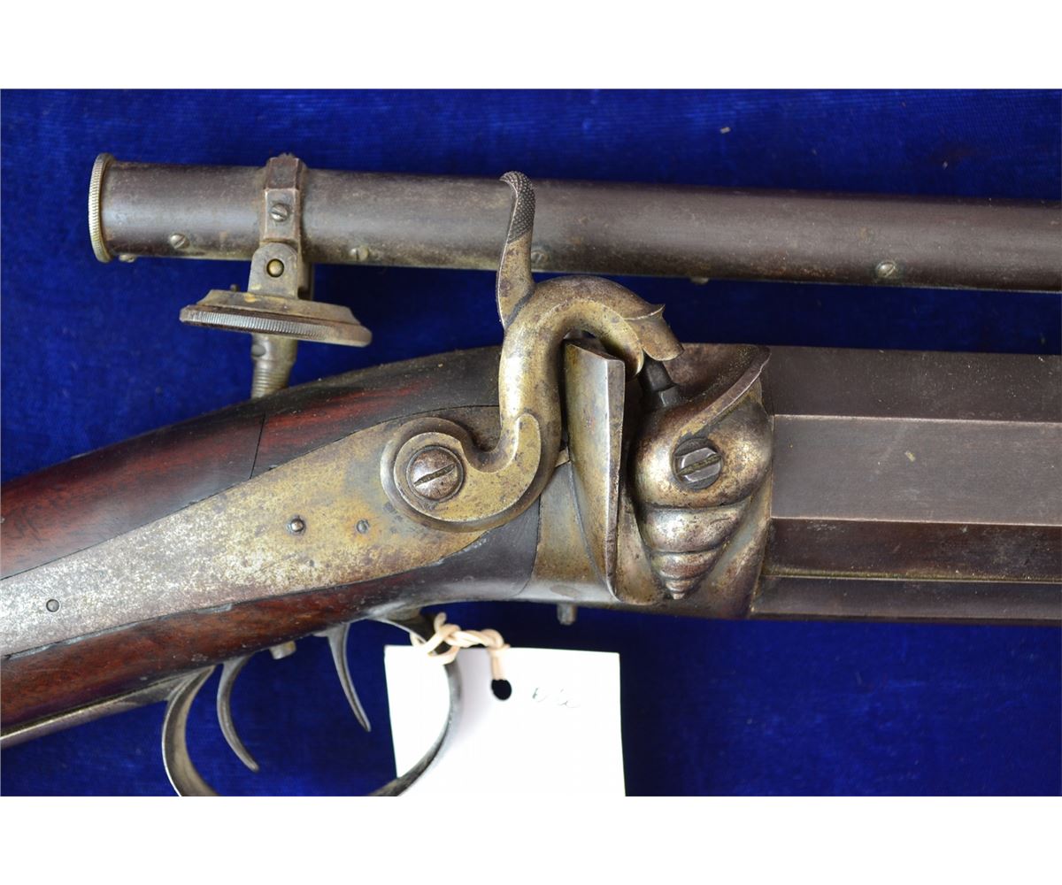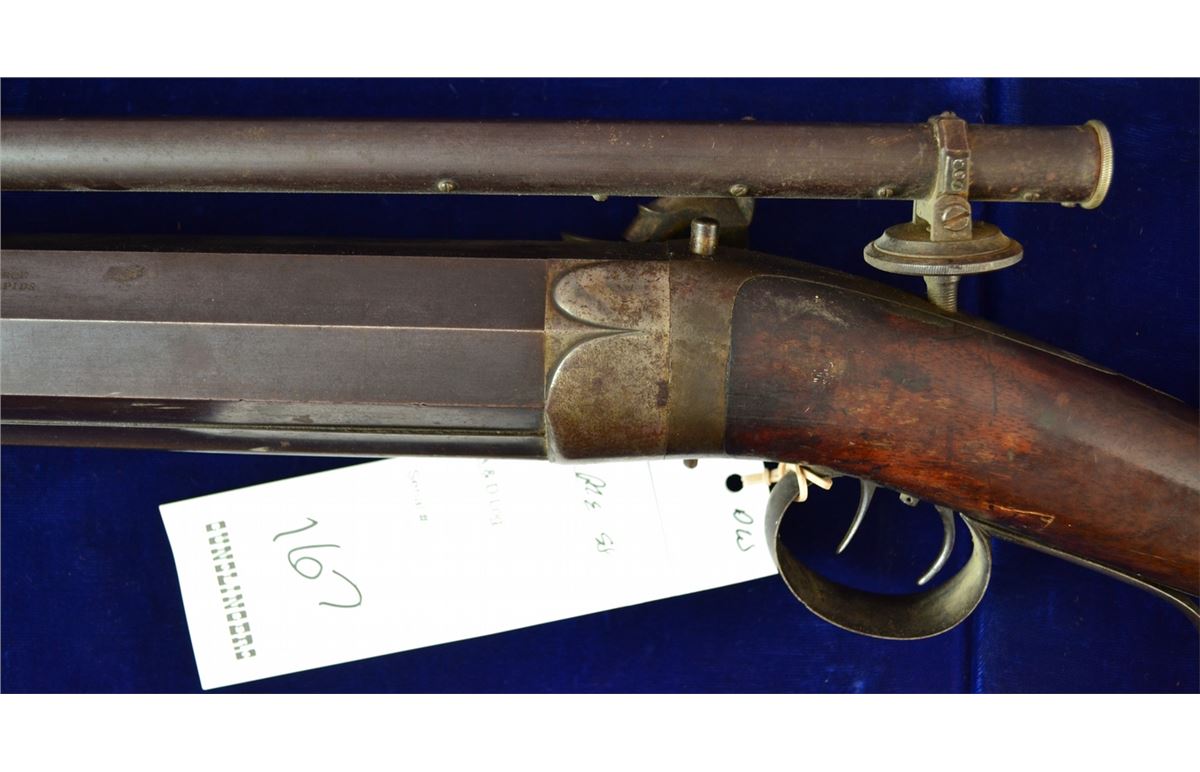 G.R. PIERCE FROM GRAND RAPIDS MICHIGAN CUSTOM BENCH RIFLE FROM THE 1850'S DOUBLE SET TRIGGERS VINTAGE ANTIQUE SCOPE CANNOT SEE THROUGH GUN IS ABOUT 30-40LBS HAS REAL INTERESTING LEATHER CAP HOLDER ATTACHED CRACK IN WRIST LOOKS TO BE 45CAL 33INCH BARREL