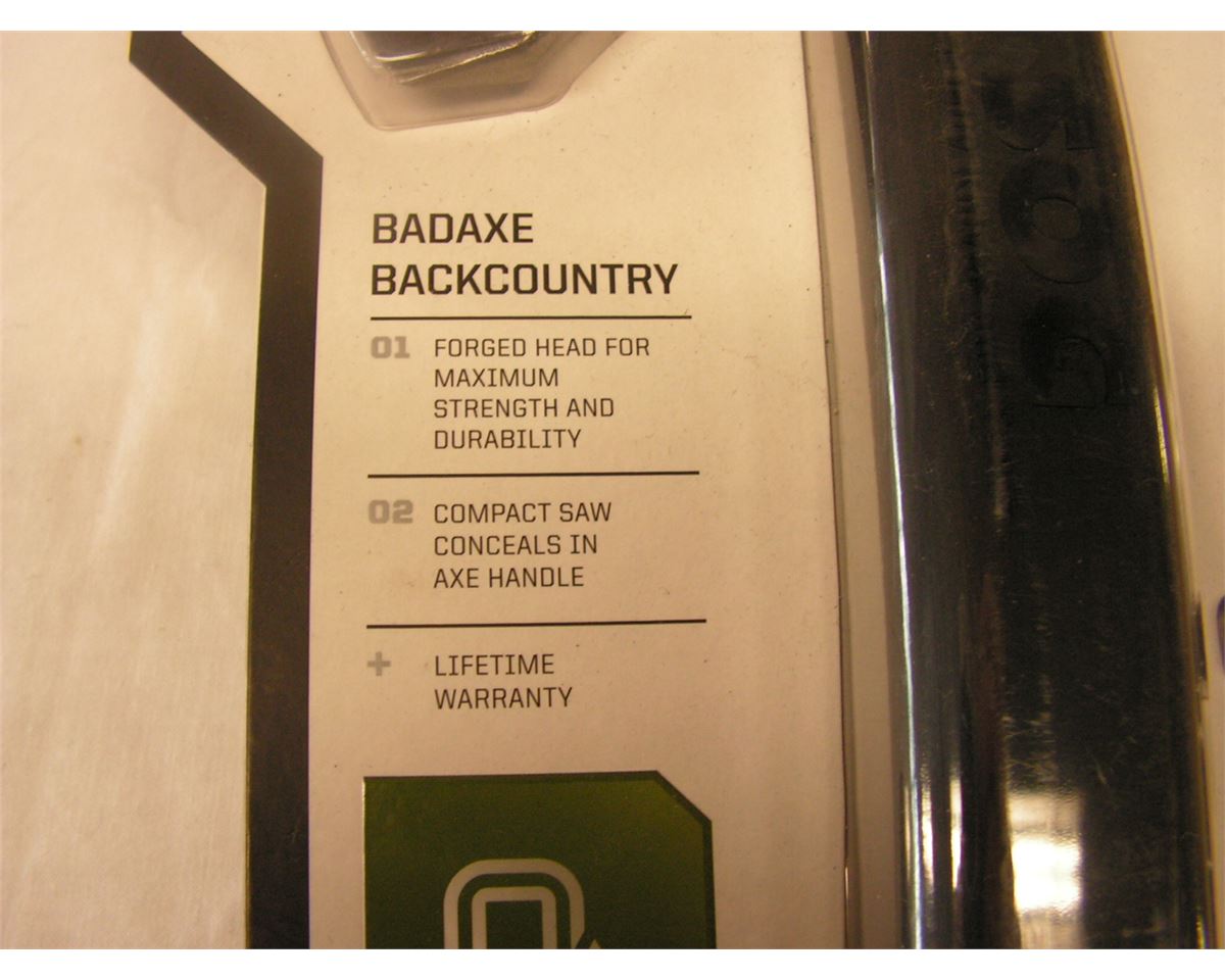 SOG brand Badaxe Backcountry axe and saw with a molded nylon sheath