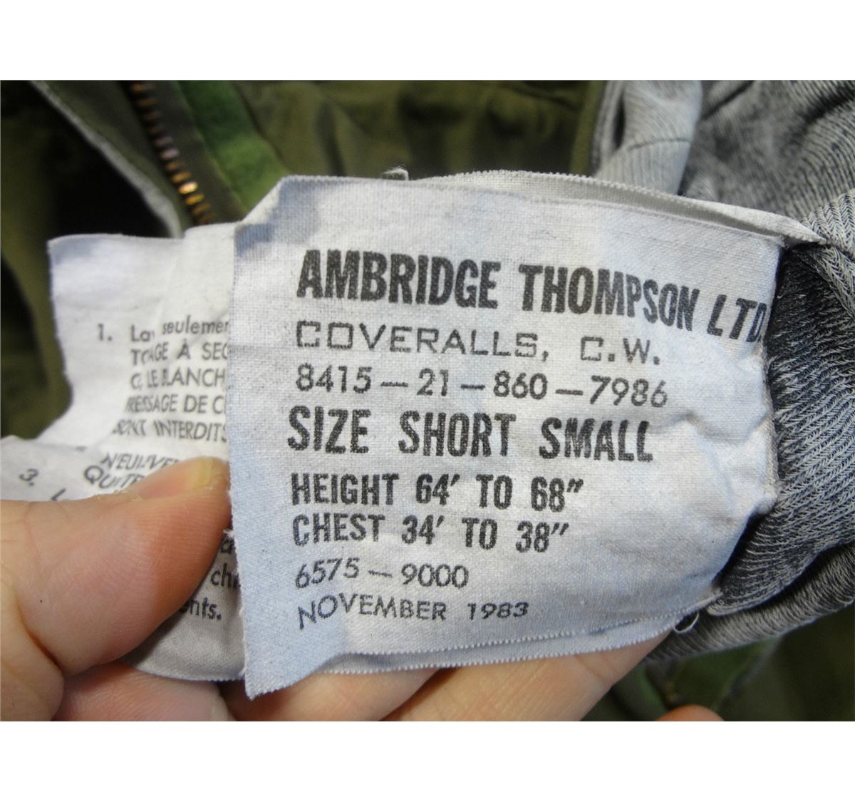 Canadian OD green army training coverall with hood from Ambridge Thompson Ltd.