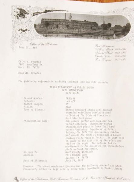 * Fully documented Colt 1911 .45 presented to Clint Peoples Texas Ranger Captain & U.S. Marshal. Unfired. With factory letter to Clint Peoples. Air tight provenance. 1 of 1200.In factory wooden display case. With Colt letters.