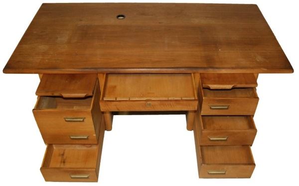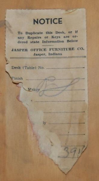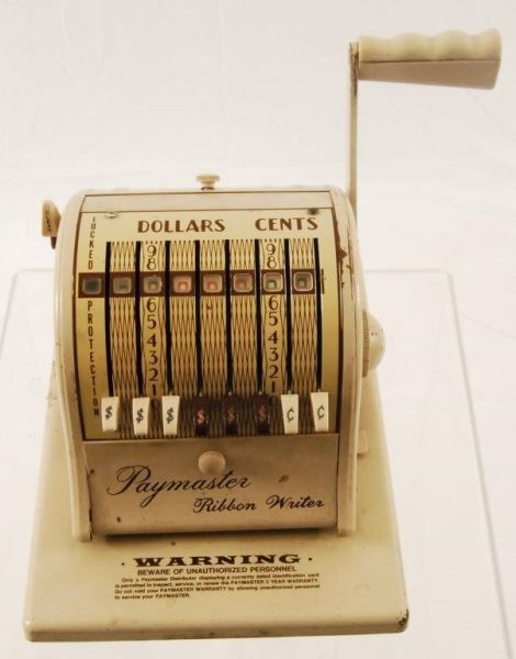 Jasper Office Company Bank Desk (30" x 39" x 77"); Chairs (23" x 24" x 34"); Vintage First National Bank of San Marcos Bag #919; Pry Tool (2-1/2" x 3-1/2" x 7"); Vintage Desk Tape Dispenser ; Paymaster Ribbon Writer