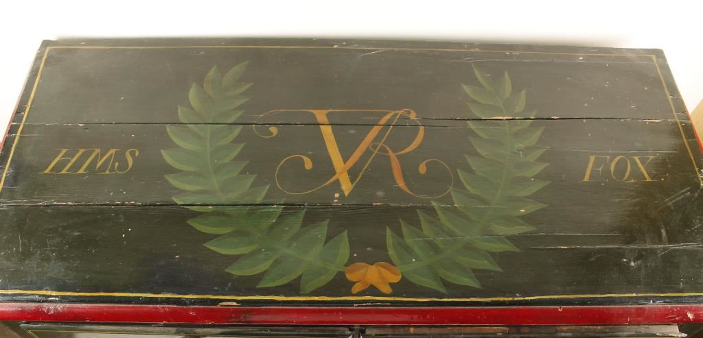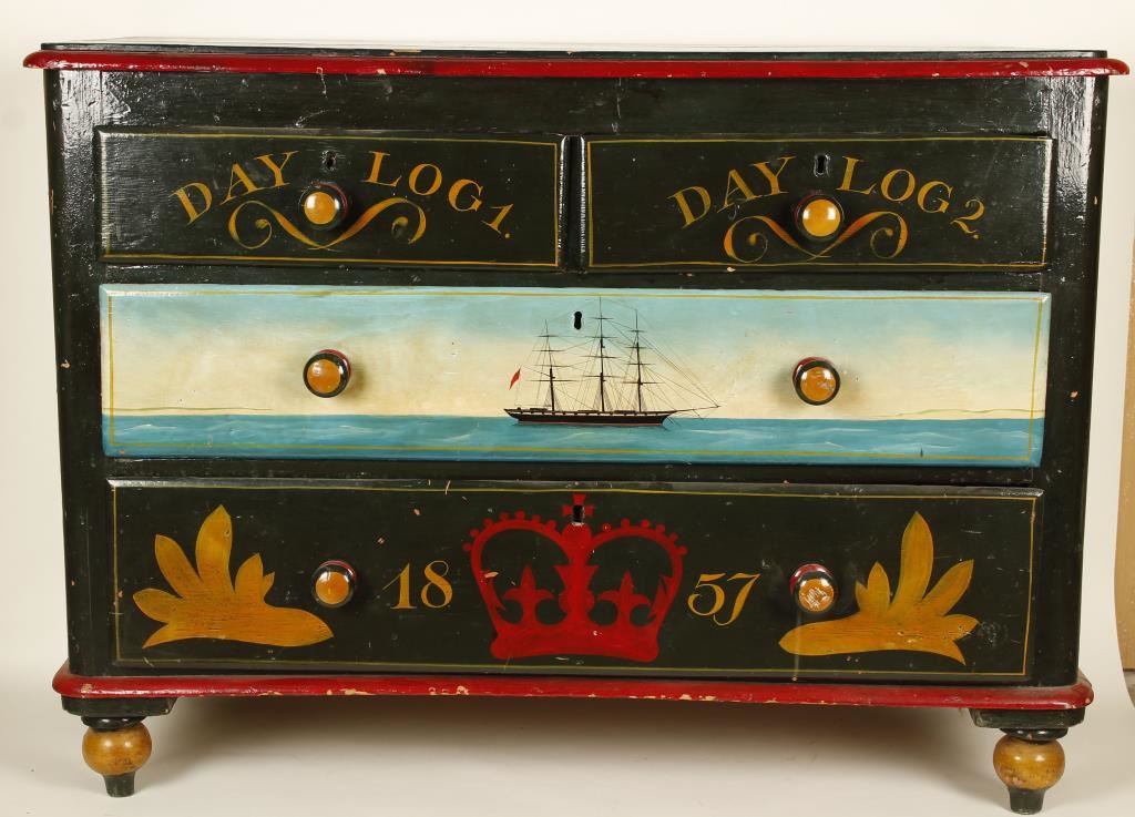Hand painted in Royal Naval Officer's style in greens, blue, and red with gold accents. Circa 1880's. Top reads "HMS VR Fox" with garland and leaves, each side of the dresser has a compass rose with fleur du lis design and the front has 4 drawers-top two read 'Day Log 1, Day Log 2',center drawer depicts a sailing schooner, and bottom drawer reads '1857' with a crown. Measures 41 1/4"x30 1/4"x18 1/2". Has some scratches and the paint is coming off in small areas.