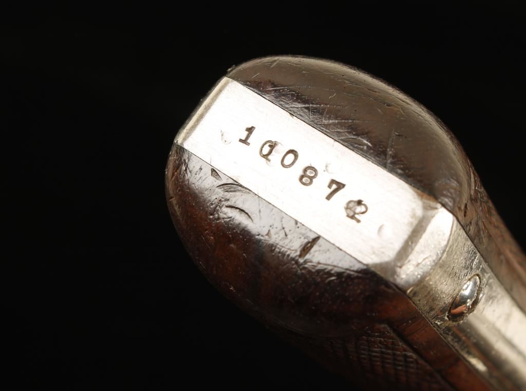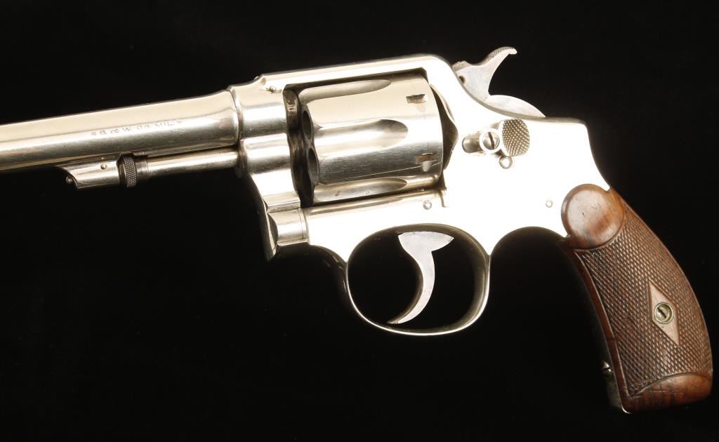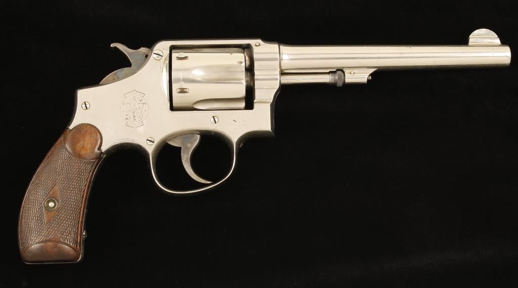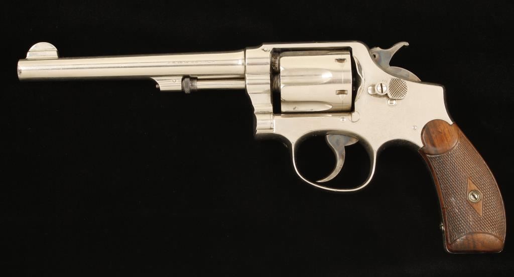 1905 1st Change, refinished nickel plated double-action 6-shot revolver with a 6" barrel. Fixed sights. Plating is dull in spots with freckling and muzzle wear. Color case hardened hammer and trigger. Checkered walnut "diamond" grips in good condition. The bore is bright with good rifling. Action is smooth and tight. Gun appears to have been re-serial number likely at the time of the refinish. Condition is good. *Modern Firearm*