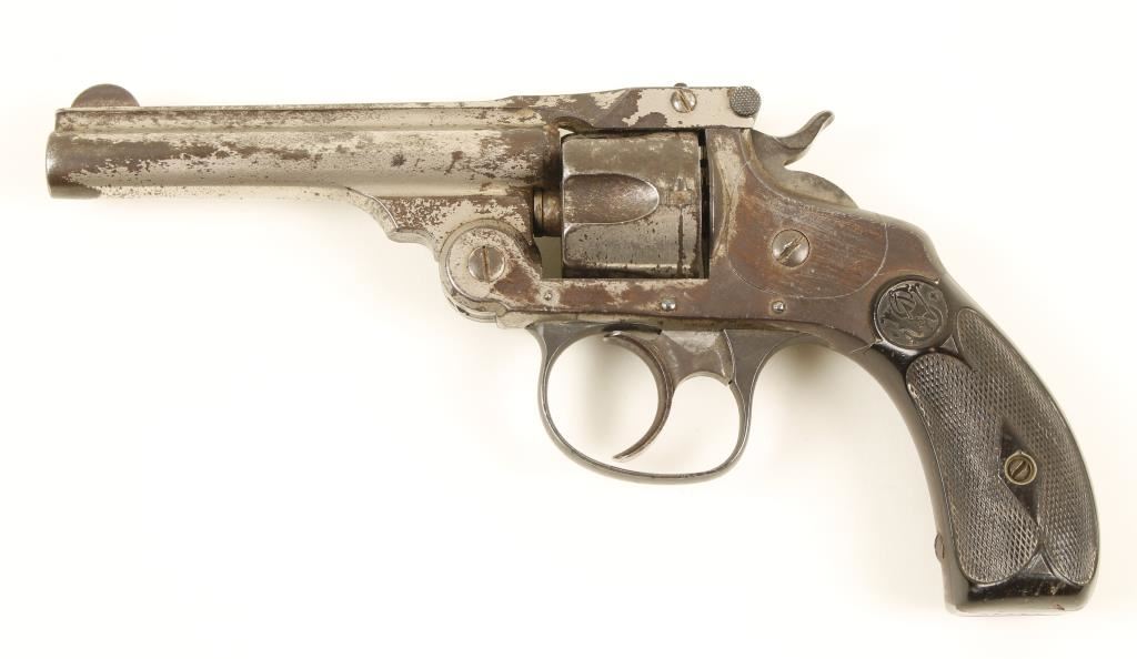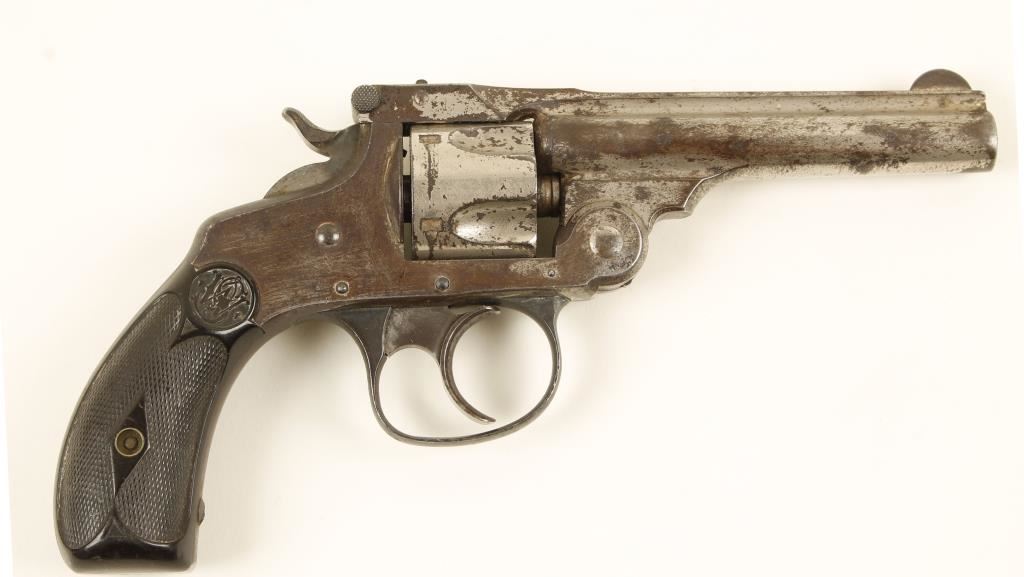 Nickel plated double action 5-shot top break revolver with a 3-1/2" barrel. Plating has approx. 25-30% remaining and is dull. Blued rounded trigger guard is from a later model. Bore is dark with pitting and sharp rifling. Chambers all have corrosion. Function is poor in single action and lock-up is poor in either single or double action. Hard rubber grips have dings with a crack and tiny chip on the bottom of one. Condition is poor. "Antique Firearm"