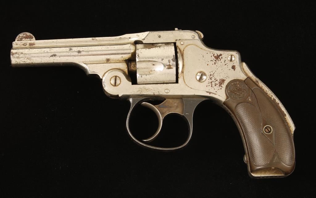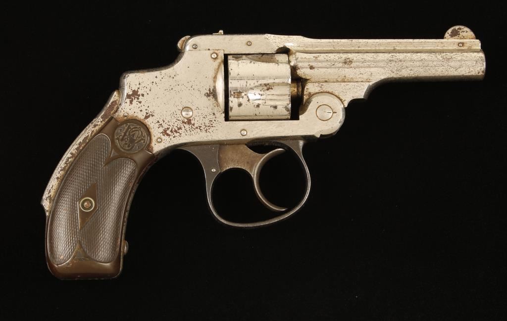 SN: 10656 . Nickel plated double-action only hammerless top-break 5-shot revolver with a 3" barrel and hard rubber grips. First model. The plating is wearing down with many dull areas and slight freckling of rust coming through. Bore is bright and shiny and the chambers are free of any deficiencies. Blued trigger guard is turning dull in spots. Grips are worn and are now a brown color, the left grip has a crack at the top and a chip missing at the bottom which exposes the locating pin in the frame. Function is good with tight lock-up. Condition is fair. *Antique Firearm*