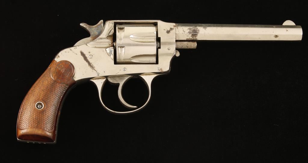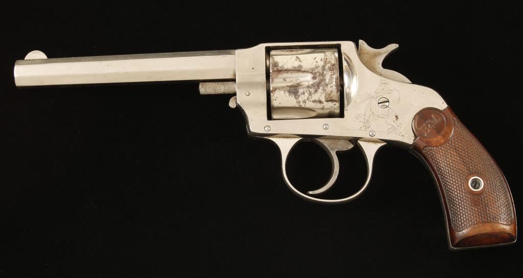 SN: 5193. Nickel plated solid frame double-action 6-shot revolver with a 4-1/2" octagon barrel and pressed wood grips. Plating is worn and dull in spots with penetrations of surface rust in a few areas. The left side of the frame has a bronc buster scene engraved in it. The bore is bright and shiny with a tiny amount of pitting. The chambers are in good shape. The checkered grips are worn but complete. Action works well in double and single action. Condition is very good. *Antique Firearm*
