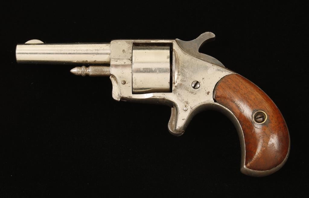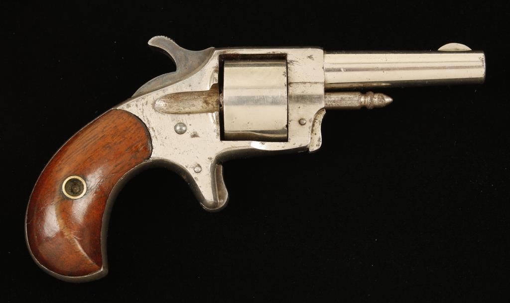NVSN.Nickel plated single-action spur trigger 7-shot revolver with a 2-1/4" barrel and wood grips. Plating is scratched and dinged with few perforations and probably 85% intact. Bore seems to be smoothbore with pitting. Chambers are dirty with a few spots of pitting. The action doesn't rotate the cylinder when cocked. The grips are worn, a little loose and have dings. Condition is poor. *Antique Firearm*