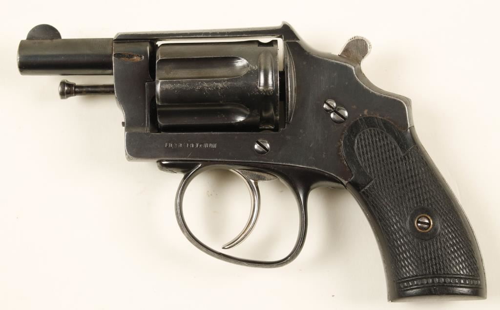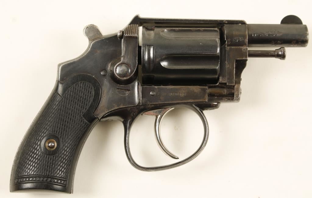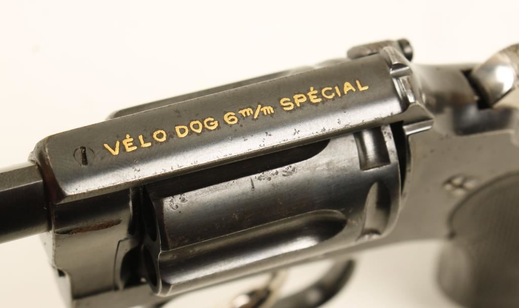 Blued double-action 6-shot revolver with a 1-5/8" barrel. Finish has light edge wear and many specks of surface rust. Bore is shiny with sharp rifling and the chambers are very good. "Velo Dog 6m/m Special" is inlaid in gold on the top strap. Functions well. Grips are checkered hard rubber with few scratches. Condition is very good. *Modern Firearm*