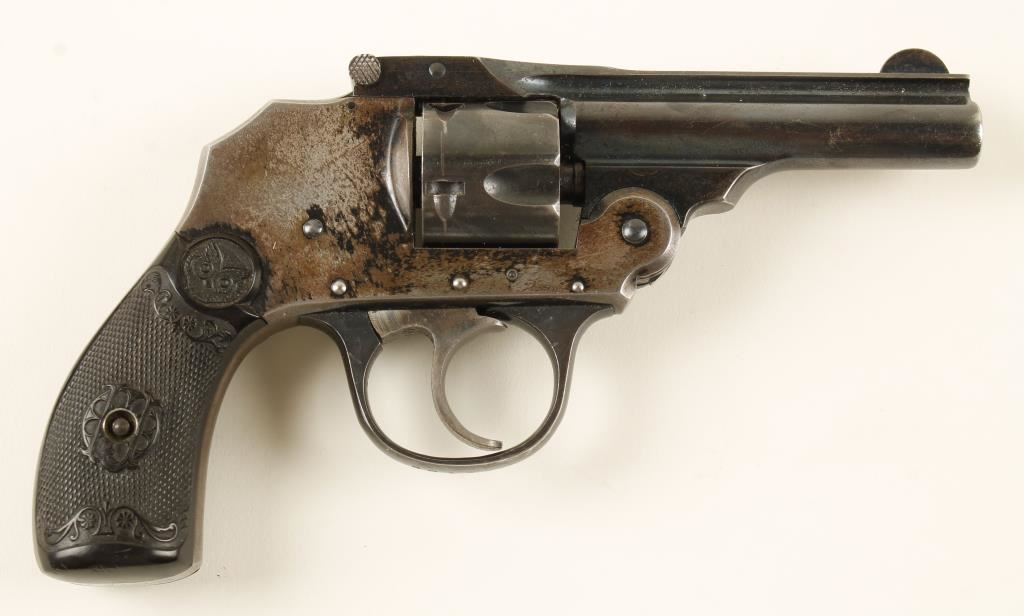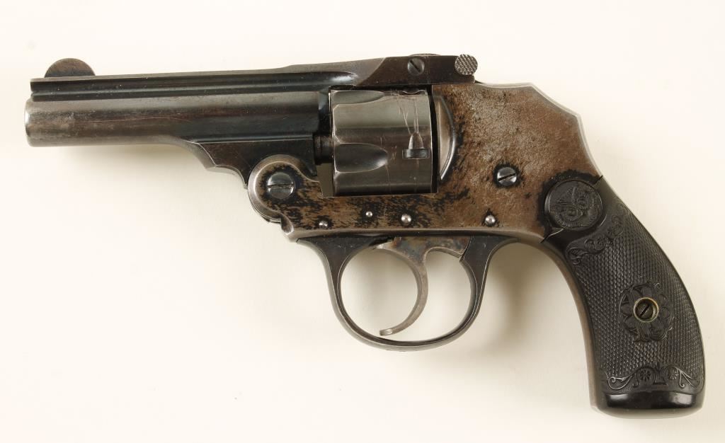 Blued double-action only top-break 5-shot hammerless revolver with a 3" barrel and checkered hard rubber "Owl Head" grips. Third or "New" Model. Bluing is fading with edge wear on the barrel and trigger guard, drag line and scratches on the cylinder, most of the bluing is gone from the frame. Trigger is faded case color. Bore is shiny with some pitting and good rifling. Chambers are in fine shape. Action works well and lock-up is good. Grips are in excellent condition. Condition is good. *Modern Firearm*