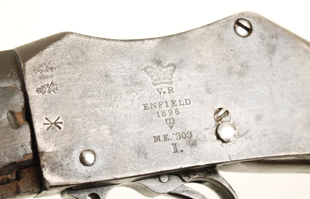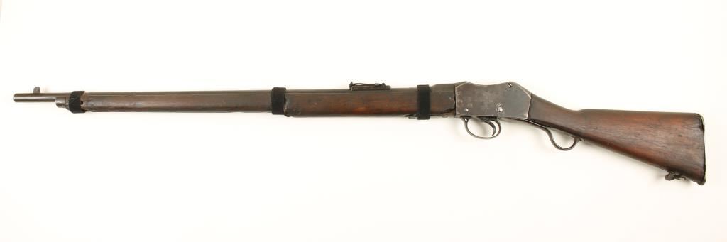 Blued single-shot slope-breech short lever British Military rifle 1884 Pattern III 1. Made in 1896 at Enfield Lock. Butt stock is stamped with Enfield cartouche, Broad Arrow proofs, "TLF" and number "1120". There is also a brass disc with "T.V. 23?" stamped on it. The butt is missing chips by the buttplate. 30" barrel has a dark bore with strong rifling that has some roughness. Action works well. Has small cocking indicator. Exterior of barrel has some major deep pitting. Rear ladder sight is bent. Receiver has good legible stampings. Forend is held on with Velcro strips but the barrel bands are in an accompanying bag. Forend has some rotted areas to it. No cleaning rod. Action works well. Condition is poor to fair. **Antique Firearm**